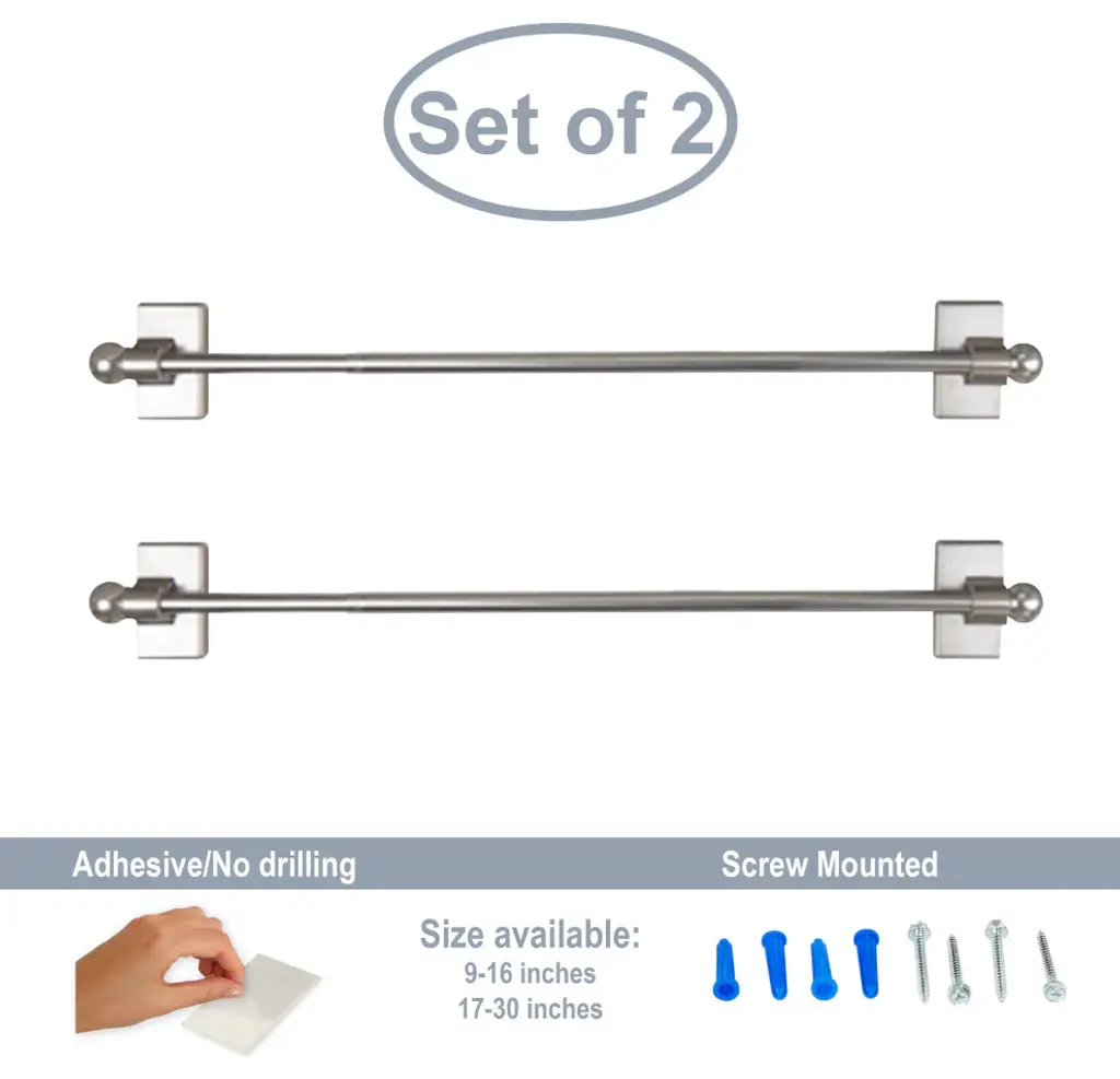 Self-Adhesive Wall Mount Rod 9"-16", Set Of 2, Satin Nickel