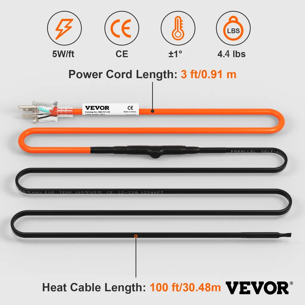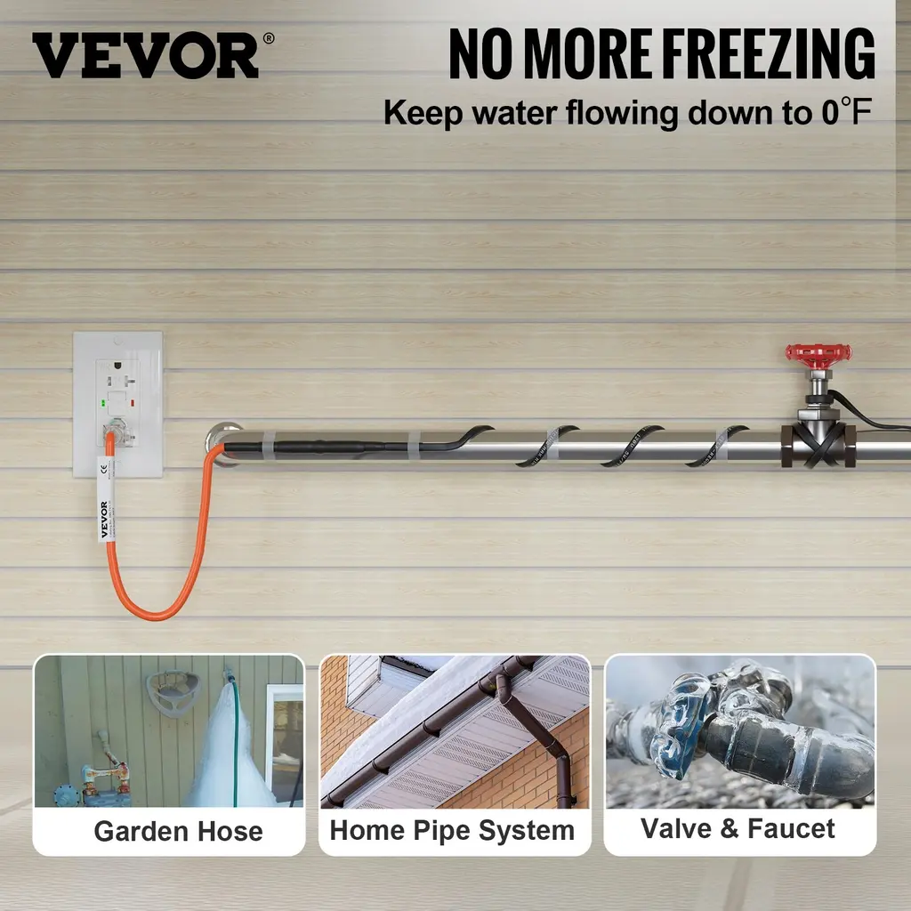 Beat the Winter: Treat your pipes right and stand up to the harshest winters. A small investment in a self-regulating pipe heating cable, a high return in protecting exterior water pipes from freezing. A helper in basements, drain, outdoor hydrants, pipe valves, faucets, etc. Perfect for plastic hose, and metal pipes. Quality You Can Trust: Our pipe heat cable has 5 W/ft and rapid heating. It only needs 5 minutes to rise 85℉ and keeps your pipes protected from 0℉ cold temperatures! You will never have an issue when everyone else has frozen pipes! CE-approved heating cable with IP68 waterproof rate assures 3 years' worth of use. Premium Built-in Thermostat: Thanks to the built-in thermostat with an accuracy of ±1°, the heat tape for water pipes automatically turns on at 43℉/6℃ of the pipe and stops working at 55℉/13℃. Compared with other heat-shrinking sleeve thermostats, our high-strength thermostat is much more secure to use. Perfect Length: The 30 ft heat cable for pipes has a 3 ft power cord, which allows it to work at long distances. / The 120 ft heat cable for pipes has a 3 ft power cord, which allows it to work at long distances. / The 18 ft heat cable for pipes has a 3 ft power cord, which allows it to work at long distances. Put the heating cable on as a "protective suit" for your pipe. /The 100 ft heat cable for pipes has a 3 ft power cord, which allows it to work at long distances. / The 6 ft heat cable for pipes has a 3 ft power cord, which allows it to work at long distances. / The 24 ft heat cable for pipes has a 3 ft power cord, which allows it to work at long distances. Put the heating cable on as a "protective suit" for your pipe. There is an indicator light on the grounded plug, and it will light when plugged in. Convenient & Smooth Installation: The pre-assembled pipe heat cable can be installed by spiral, crossing, straight, etc. No risk of overheating! It is very easy to install due to its flexibility. Focus on your next big project sooner with our quick installation. We are warmed up and ready! Are you? Package Content 1 x Self-regulating Pipe Heating Cable 1 x 20 m Heat-resisting Tape