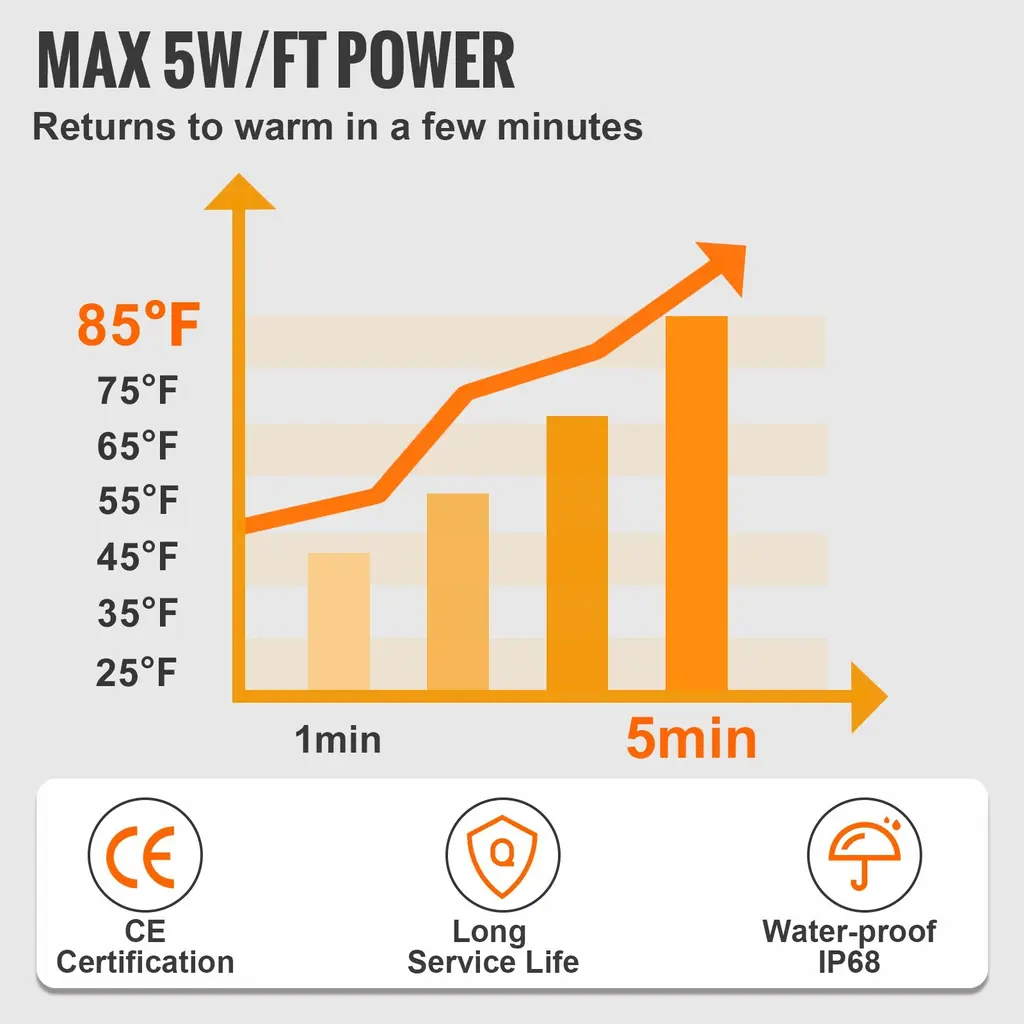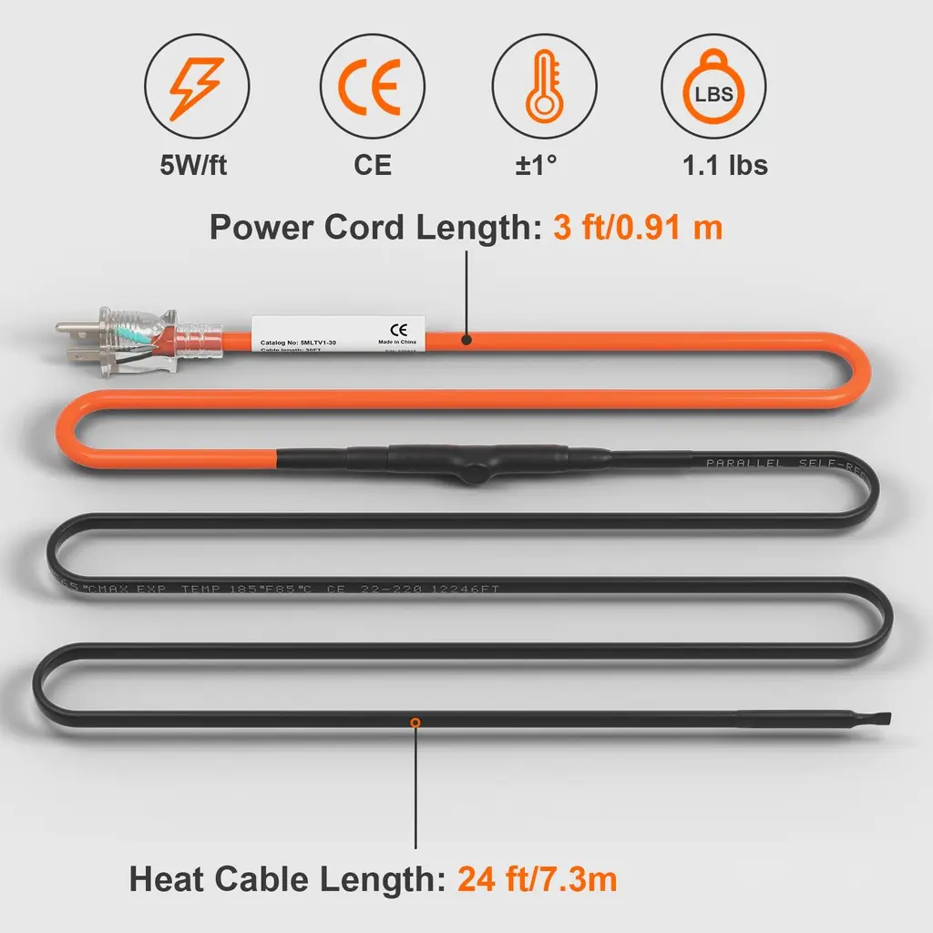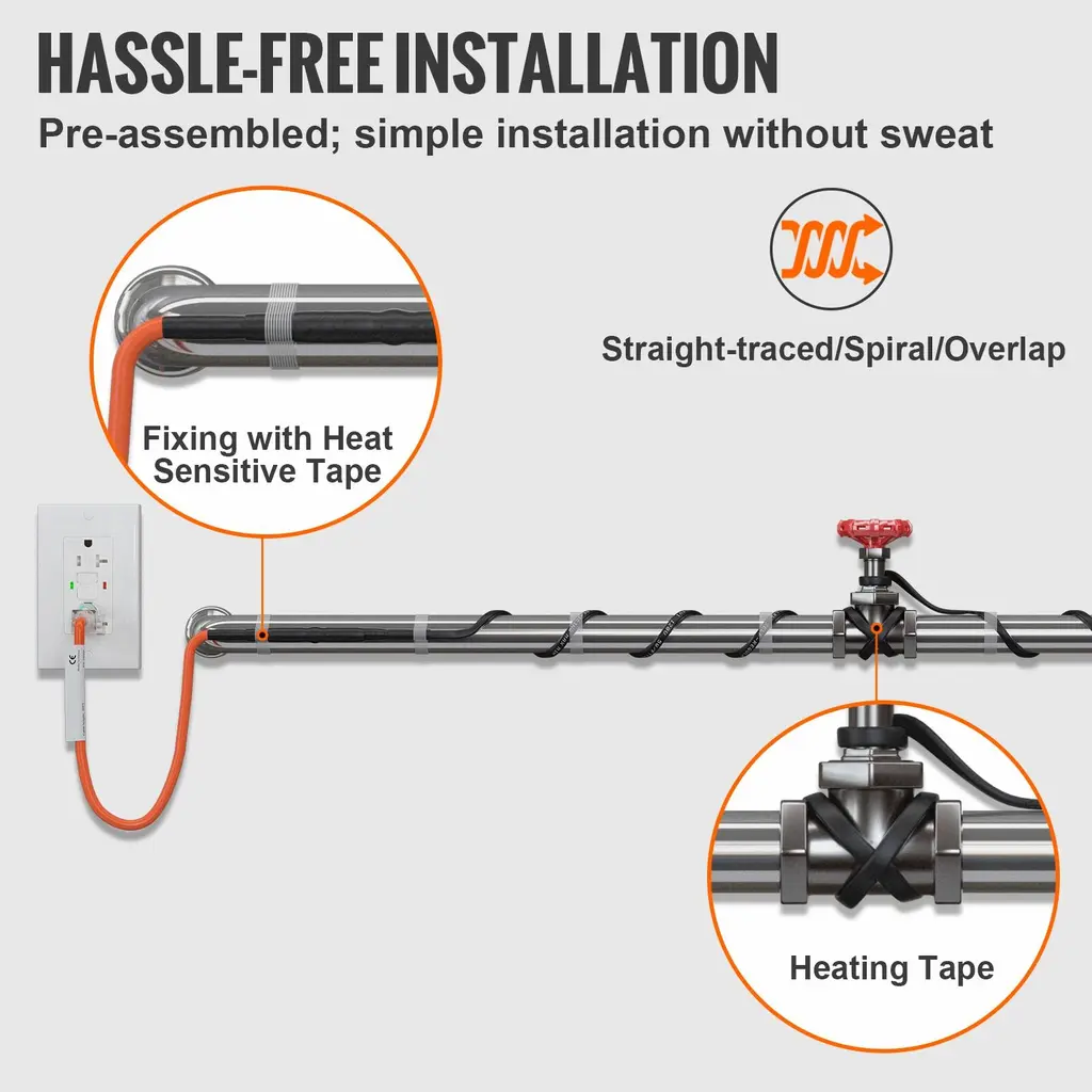 Beat the Winter: Treat your pipes right and stand up to the harshest winters. A small investment in a self-regulating pipe heating cable, a high return in protecting exterior water pipes from freezing. A helper in basements, drain, outdoor hydrants, pipe valves, faucets, etc. Perfect for plastic hose, and metal pipes. Quality You Can Trust: Our pipe heat cable has 5 W/ft and rapid heating. It only needs 5 minutes to rise 85℉ and keeps your pipes protected from 0℉ cold temperatures! You will never have an issue when everyone else has frozen pipes! CE-approved heating cable with IP68 waterproof rate assures 3 years' worth of use.Premium Built-in Thermostat: Thanks to the built-in thermostat with an accuracy of ±1°, the heat tape for water pipes automatically turns on at 43℉/6℃ of the pipe and stops working at 55℉/13℃. Compared with other heat-shrinking sleeve thermostats, our high-strength thermostat is much more secure to use. Perfect 80/60/30/24/18 ft Length: The 80 ft heat cable for pipes has a 3 ft power cord, which allows it to work at long distances. Put the heating cable on as a "protective suit" for your pipe. There is an indicator light on the grounded plug, and it will light when plugged in. Convenient & Smooth Installation: The pre-assembled pipe heat cable can be installed by spiral, crossing, straight, etc. No risk of overheating! It is very easy to install due to its flexibility. Focus on your next big project sooner with our quick installation. We are warmed up and ready! Are you? Package Content 1 x Self-regulating Pipe Heating Cable 1 x 20 m Heat-resisting Tape