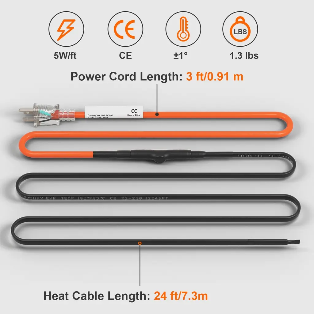 Self-Regulating Pipe Heating Cable Metal And Plastic Pipe From Freezing - 24-Feet