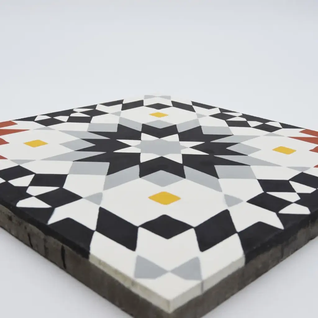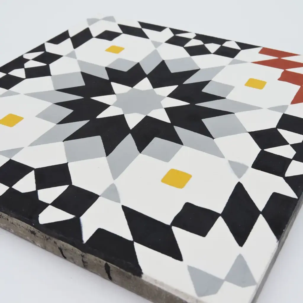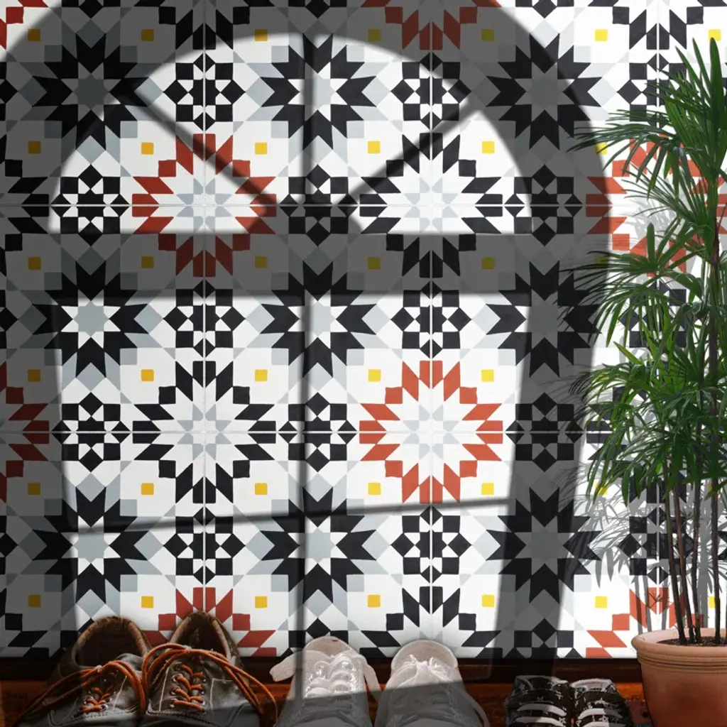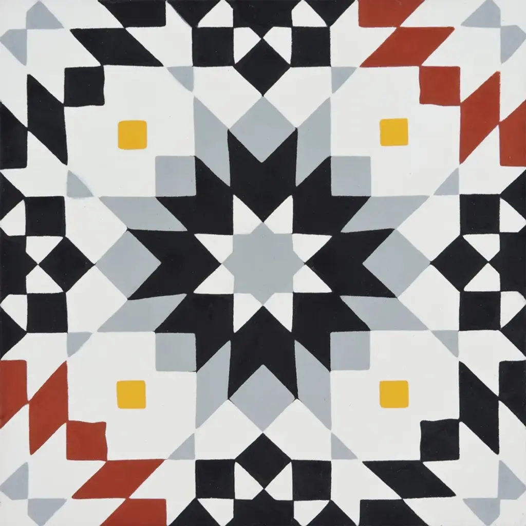 Semara is a vibrant and dynamic cement tile. Its black, gray, and white pattern with red and yellow accents, brings a charming life to any room.