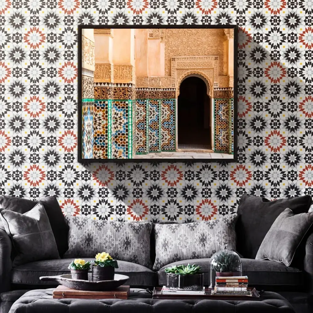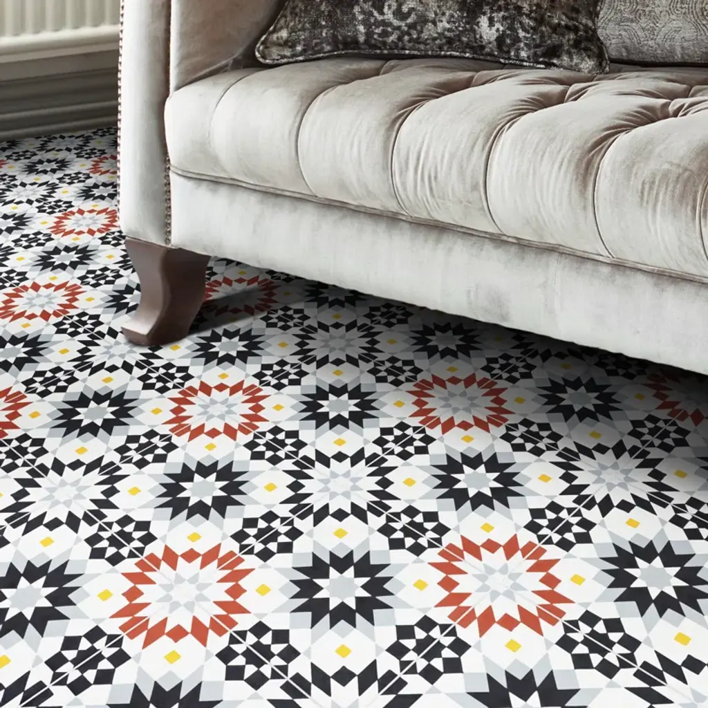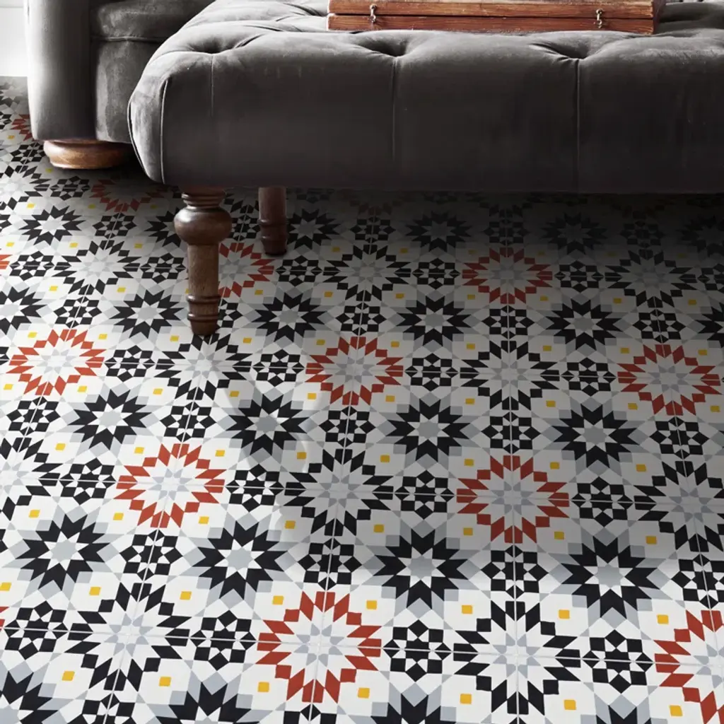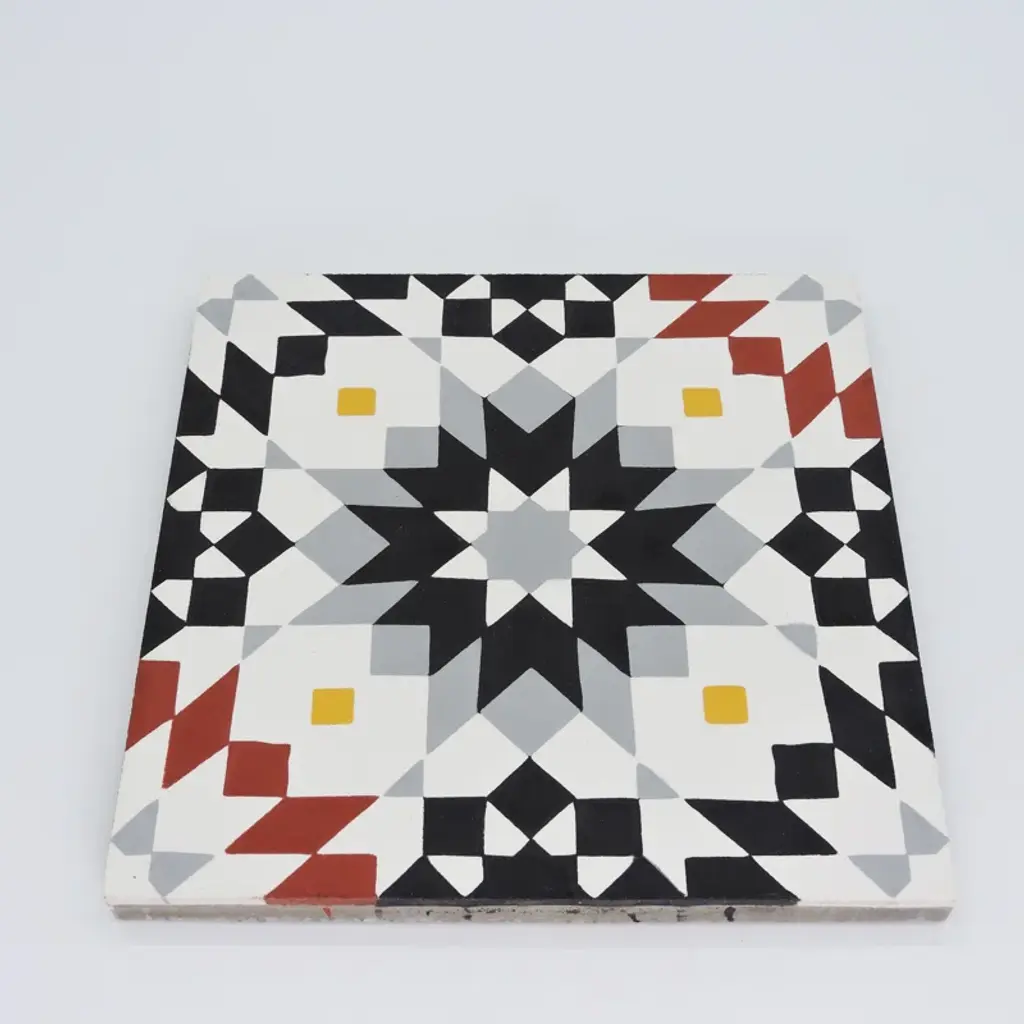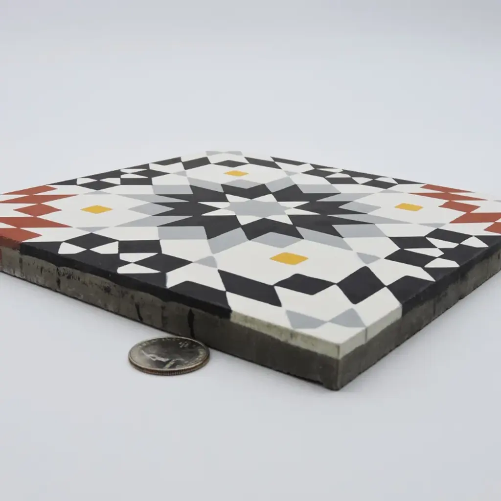 Semara is a vibrant and dynamic cement tile. Its black, gray, and white pattern with red and yellow accents, brings a charming life to any room.