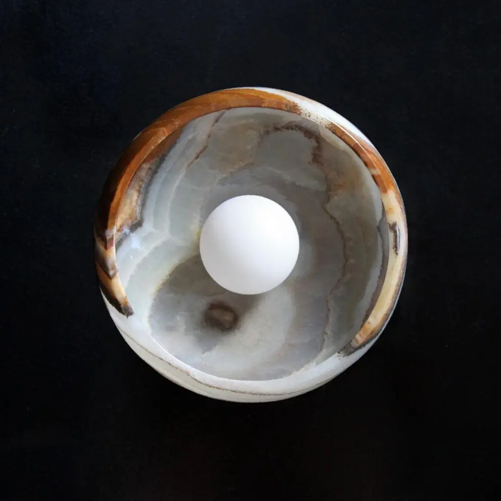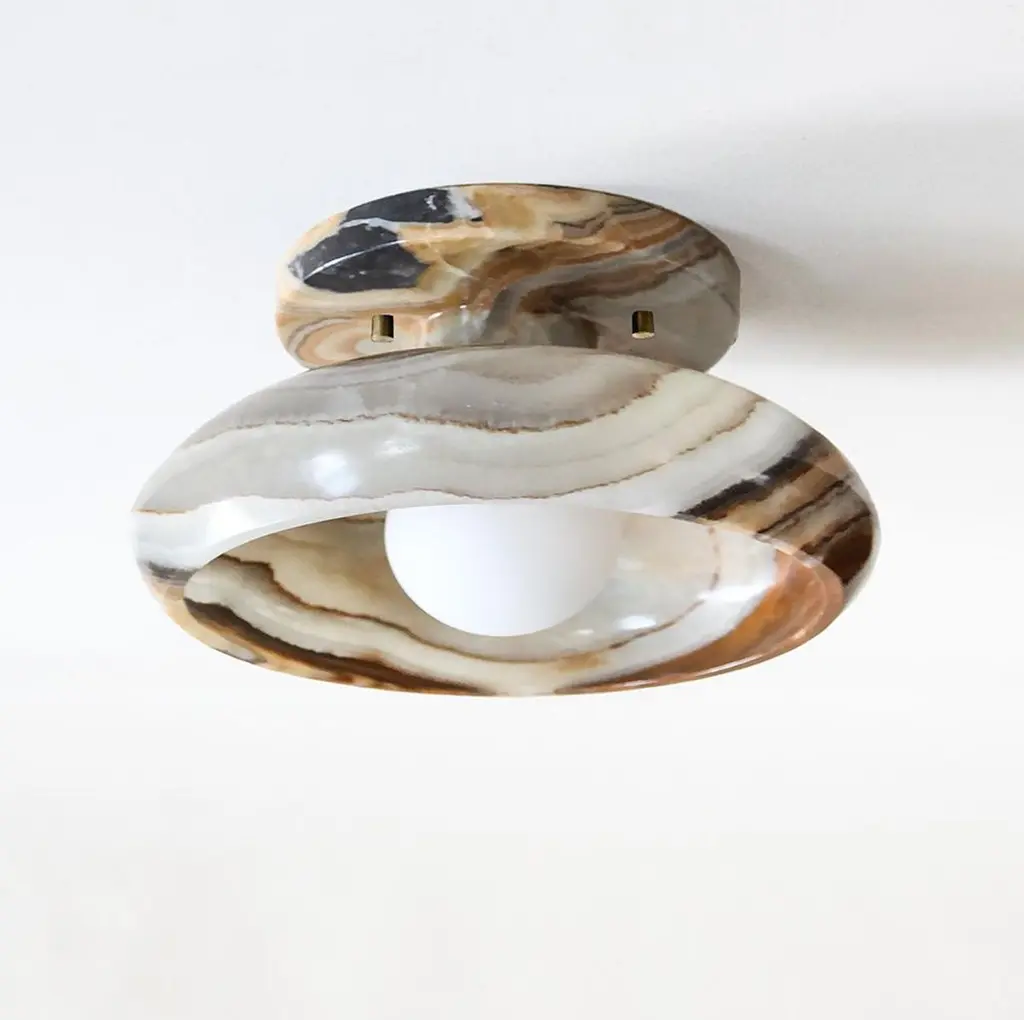 Our Piedra lighting takes its inspiration from the stone masks of the ancient civilization of Teotihuacán. Carved in the Mexican city of Tecali which means ‘stone house’ in Nahuatl the fixtures draw on the clean lines, defined angles, and streamlined silhouettes that epitomize the pre-Colombian stone masks. Sculpted from carefully chosen marble or onyx, each piece reflects the unique character of the individual stone from which it is formed.Wall or ceiling mount; hardwired, requires professional installation.Single socket for type A bulb up to 60w.Tala, Porcelain II LED bulb included.UL listed.Brass hardware (standard) or brushed nickel hardware (upon request).Also available in milk onyx, black onyx, black and white onyx, travertine marble, and special edition rose onyx.Each piece in this collection is cut from carefully selected stone blocks. Every natural stone product is unique; variation in color, tone, veining and pattern is to be expected as part of the stone’s inherent characteristics. Markings, lines and crystallization are a natural part of the stone’s beauty. Images and samples are indicative of the color and characteristics of the stones we work with in this collection and are not meant to portray an exact representation of the actual piece that you will receive.