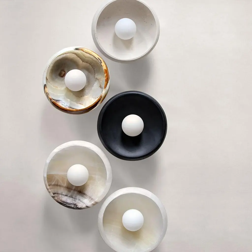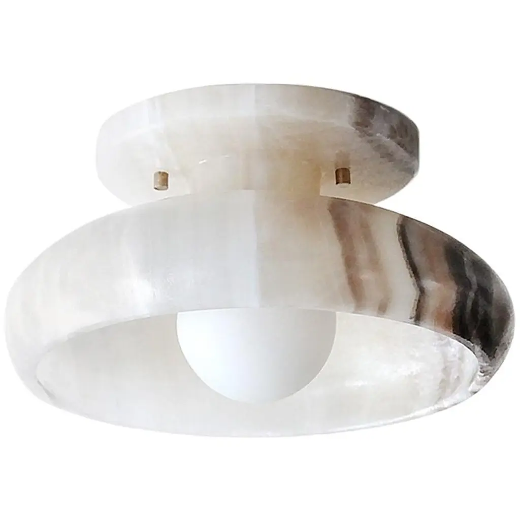 Our Piedra lighting takes its inspiration from the stone masks of the ancient civilization of Teotihuacán. Carved in the Mexican city of Tecali, which means ‘stone house’ in Nahuatl, the fixtures draw on the clean lines, defined angles, and streamlined silhouettes that epitomize the pre-Colombian stone masks. Sculpted from carefully chosen marble or onyx, each piece reflects the unique character of the individual stone from which it is formed.Wall or ceiling mount; hardwired, requires professional installation.Single socket for type A bulb up to 60w.Tala, Porcelain II LED bulb included.UL listed.Brass hardware (standard) or brushed nickel hardware (upon request).Also available in terra onyx, milk onyx, black + white onyx, black onyx, and special edition rose onyx..Each piece in this collection is cut from carefully selected stone blocks. Every natural stone product is unique; variation in color, tone, veining and pattern is to be expected as part of the stone’s inherent characteristics. Markings, lines and crystallization are a natural part of the stone’s beauty. Images and samples are indicative of the color and characteristics of the stones we work with in this collection and are not meant to portray an exact representation of the actual piece that you will receive.