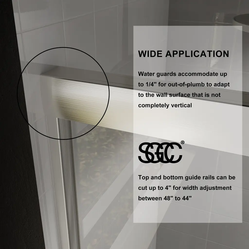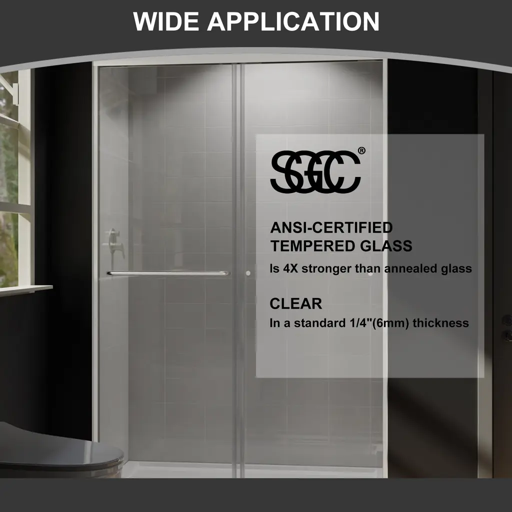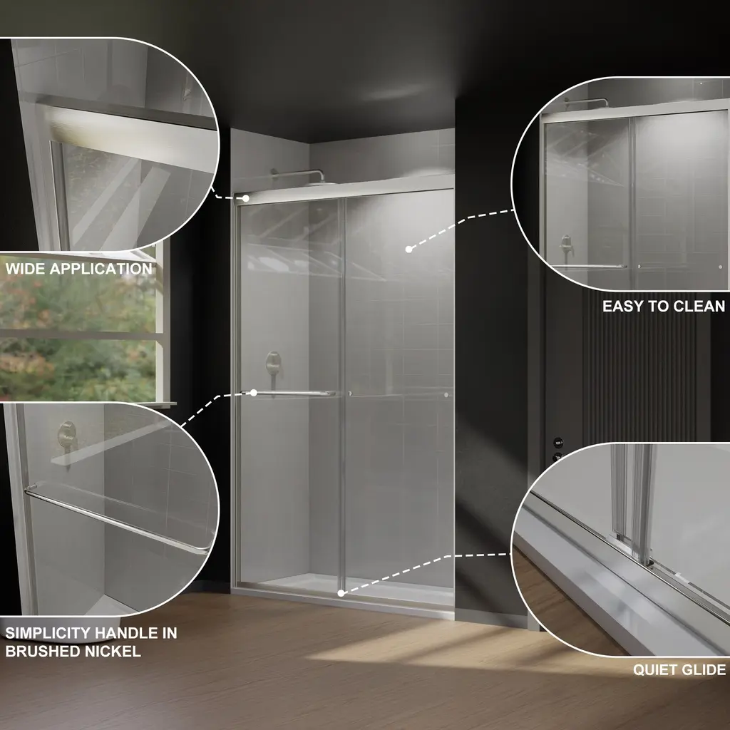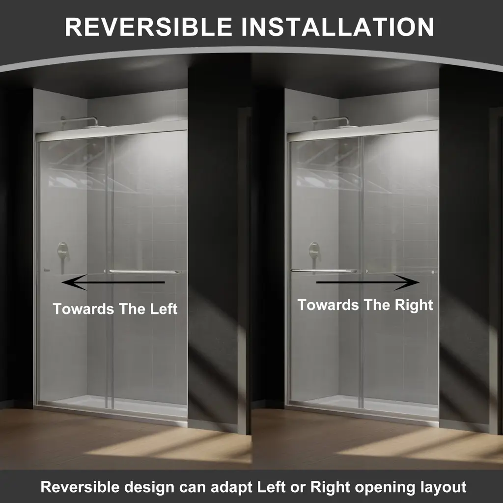 The Frameless shower door brings a simplicity and practicability to your bathroom with its eye-catching design. It will definitely be an durable component of your bathroom with its superior quality tempered glass and durable stainless steel hardware. The door is reversible in accordance with your decoration requirements. Easy installation, water proof and durable materials can help us bring you a convenient and wonderful experience when you are enjoying taking a shower. Features: In summary, this tempered glass semi-frameless double sliding shower door is a high-quality product that combines safety, practicality, and durability.