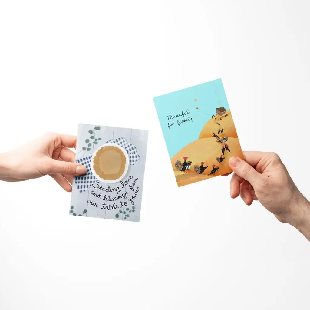 This 3-pack of assorted Fall/Autumn/Thanksgiving greeting cards is elegantly illustrated by artist Ingrid Ramus, founder and owner of the Ramus & Co brand. The cards are blank inside. All greeting cards are made in the USA on heavyweight uncoated and locally-manufactured card stock. Each card is individually wrapped in TUV Austria certified-compostable PLA sleeves that meet both ASTM D6400 & EN 13432 standards. Each card is accompanied by a hand-embossed envelope made with heavyweight 95lb paper and a peel-and-stick flap - no licking envelopes here! All Ramus & Co. greeting cards are printed on FSC¬¨¬ and SFI¬¨¬ certified paper sourced from a regional mill that harnesses 66% of its energy from on-site sustainable sources, such as emission-free hydroelectricity and biomass co-generation from wood waste. Additionally, our greeting cards are thoughtfully packaged in bags made from certified compostable PLA material. Husband-and-wife team Calvin and Ingrid Ramus founded Ramus & Company in 2019, in New England, USA. Ingrid, the creative designer behind the brand, originates from Mexico, where she cultivated her skills in fashion and textile design. Drawing from her unique and inquisitive perspective on preppy style, Ingrid prolifically designs whimsical yet classic stationery and lifestyle items.