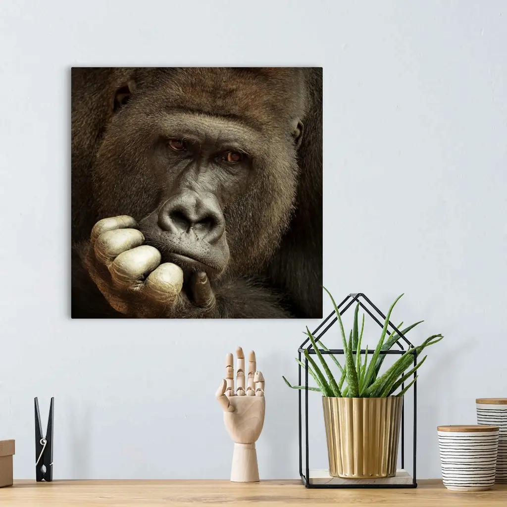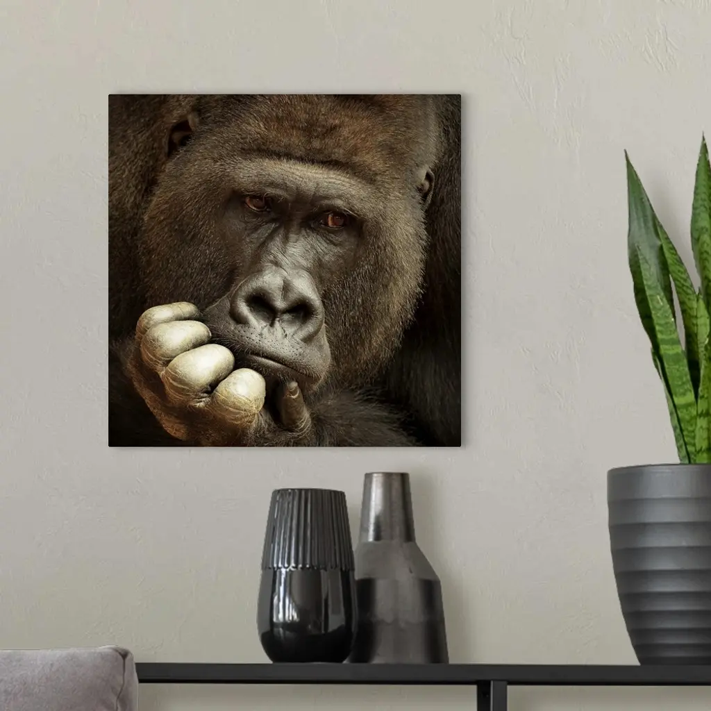 Portrait of a gorilla with its hand on its chin looking at something thought.