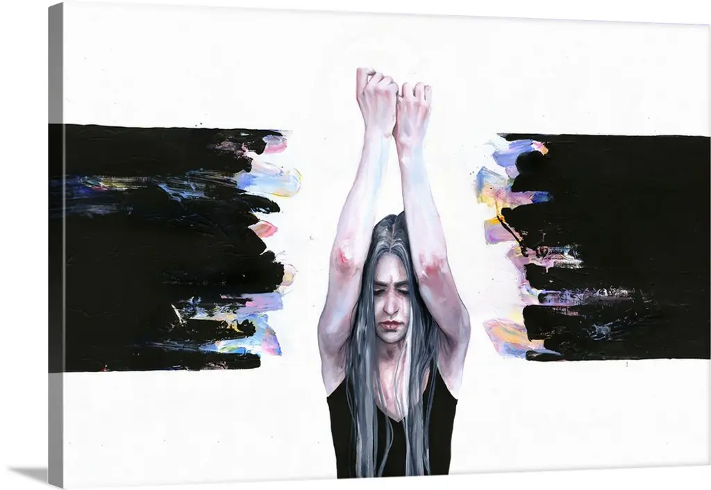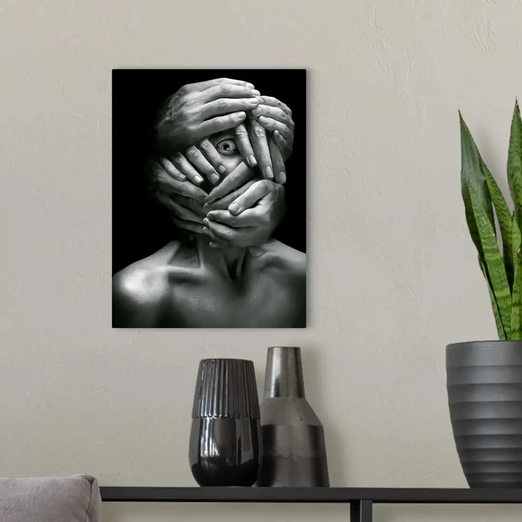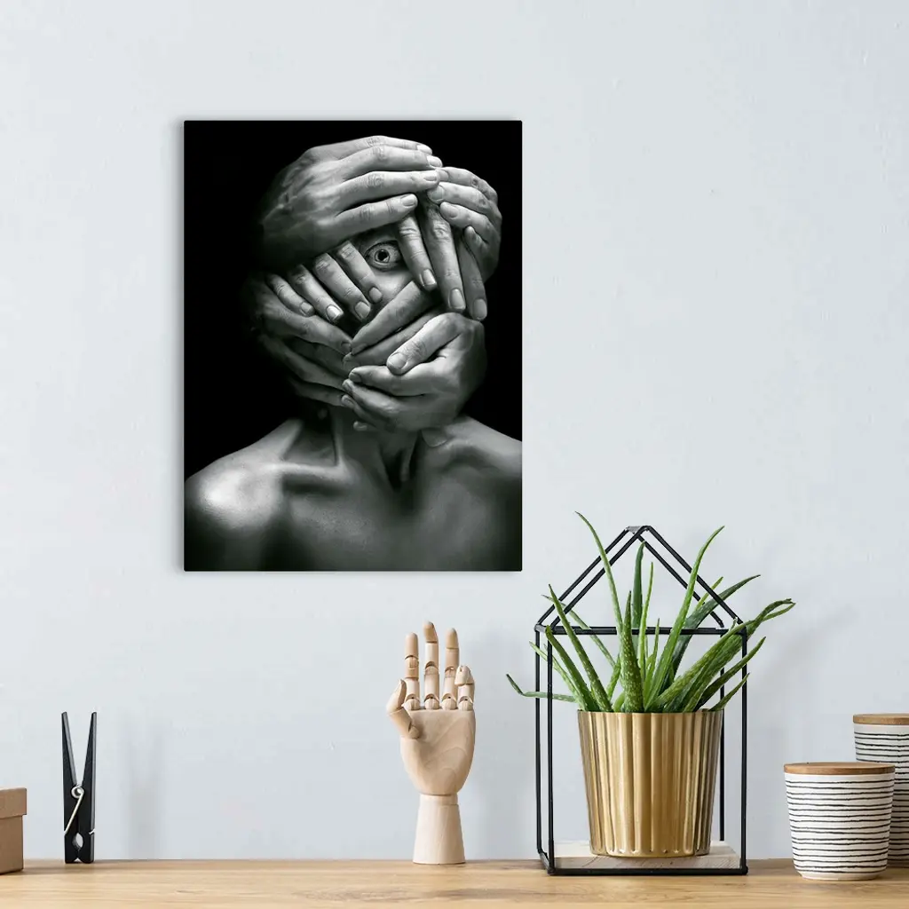 Portrait of a person whose face is covered in several hands, with one eye visible.