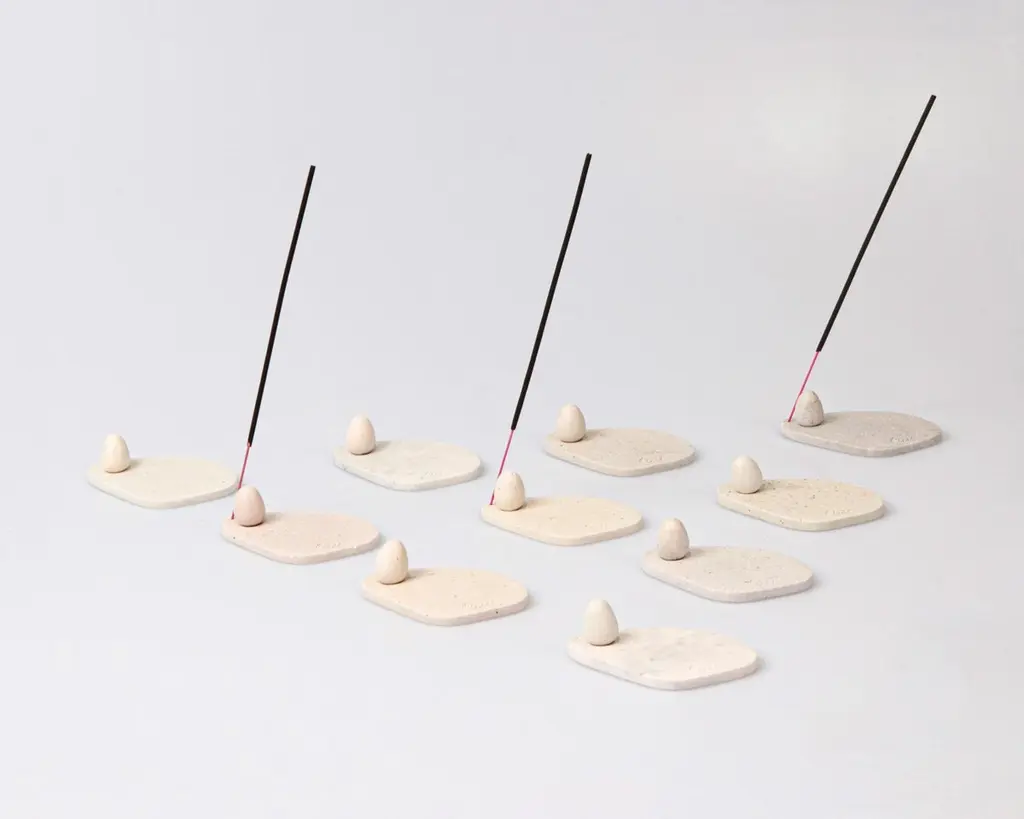 This series is made using eggshells discarded from an ice cream shop and shells from Tong-yeong, Korea. There is an ice cream shop that makes gelato next to The WKND Lab’s workspace. They make ice cream based on eggs, not milk. In the process, 300 eggs are consumed every week and many shells are thrown away. Since then, based on the fact that CaCO3 is what mostly constitutes an eggshell, we got interested in oyster shells, which have the same composition- and decided to plan this Oygg series using eggshells and oyster shells. Because it is handmade, all products have diferent colors and patterns. The eggshell has a pink/orange color and the shell has a subtle grayish blue color, so if you use these to create texture, each piece will have a diferent shape and color.WKND Lab specializes in various design disciplines, including material research, object design, furniture design, and art installation. With a focus on material-driven narratives, WKND Lab communicates its philosophy about the dynamic interplay between design, humanity, and the natural environment. From Oygg SeriesMaterial : Egg Shells, JesmoniteDimensions: 30 W x 13.6 D x 0.6 H (cm)Individual size: 10 W x 6.8 D x 0.6 H (cm)Weight: 1 kgProduction time is 5 weeks.Oygg series Oyster shell Incense Holder is made with upcycled eggshells collected from a local ice cream shop..