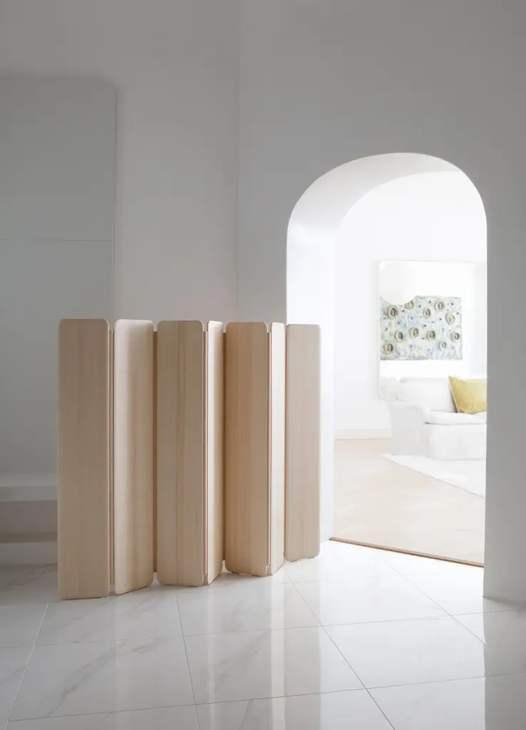 The simple and carefully detailed Separat space divider lets the wooden surfaces speak. The clever natural tanned leather hinge grows old together with the wooden components, creating a beautiful patina. The Separat was launched in 2018. The Separat space divider by Cecilie Manz is the first piece of furniture in Finland to receive the prestigious EU Ecolabel certificate 2021.Materials:AshSurface finish:Natural wood oil mixDimensions:Width 1800 mmDepth 16 mmHeight 1350 mm