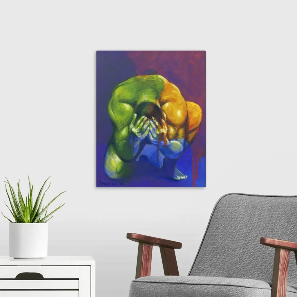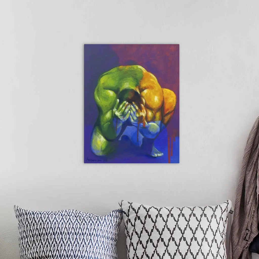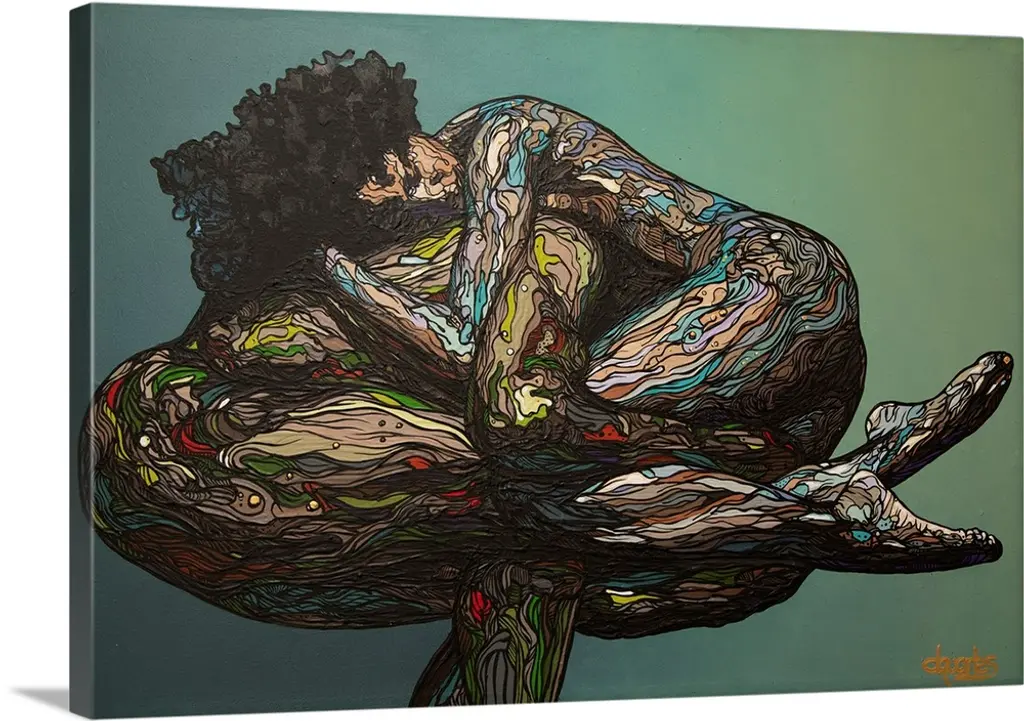 With head in hands, a man is distraught. Red paint flows like desperation from his hands, or perhaps like the blood of his lacerated emotions. Aricadia paints a dramatic portrait in vivid color. 'Where did you hide Adam's rib? He laid it in Canaan with the dry body Because the memory of the separation with Eve Hurts more than the separation itself,' the artist says.