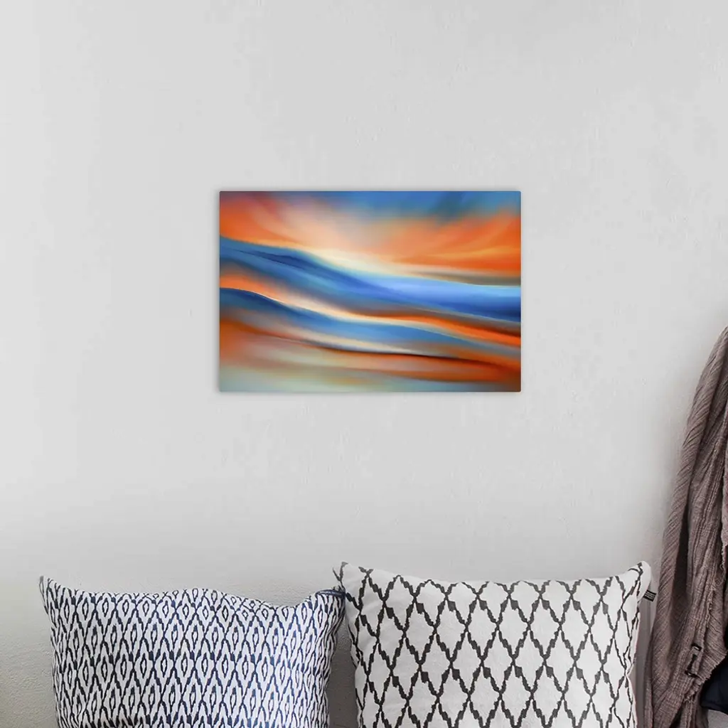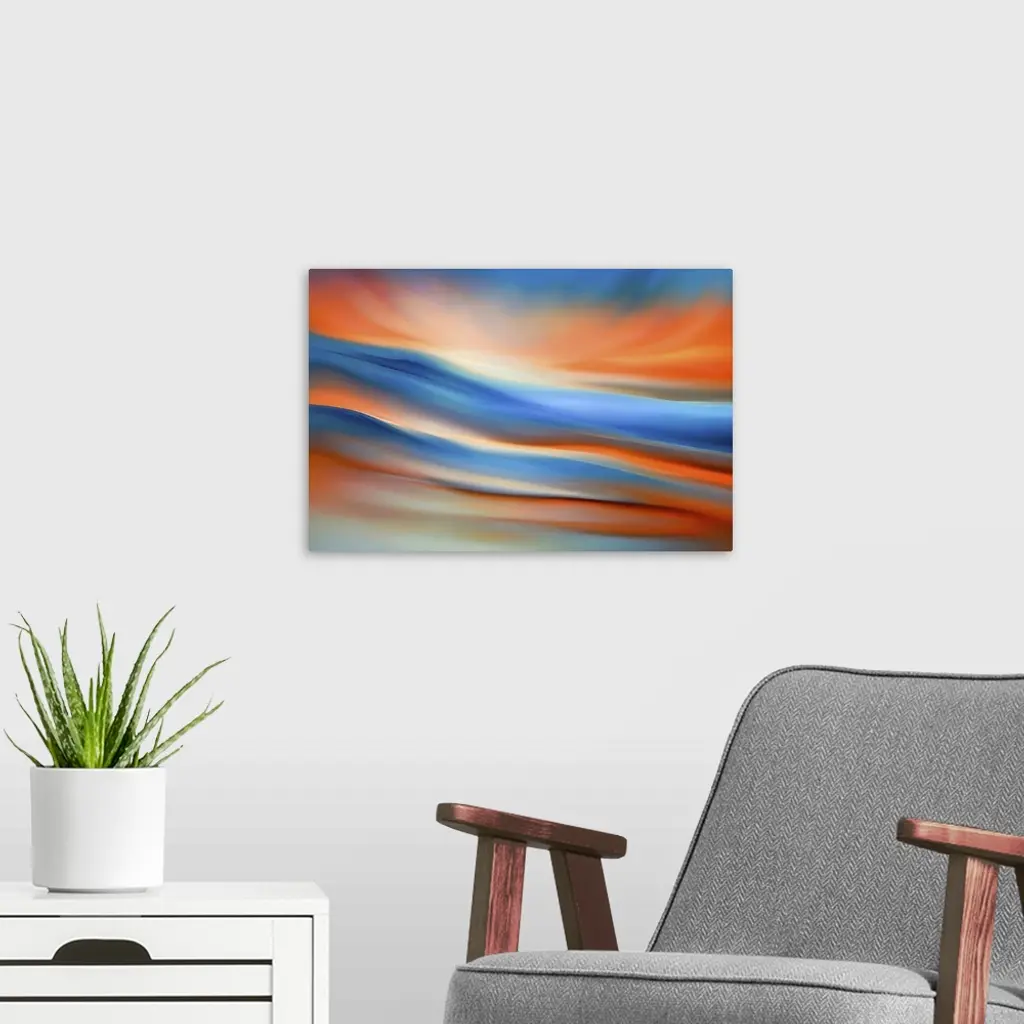 Vibrant swirls of blue and orange blend seamlessly, creating a sense of movement and depth. The colors merge together in a fluid, dynamic wave-like pattern.