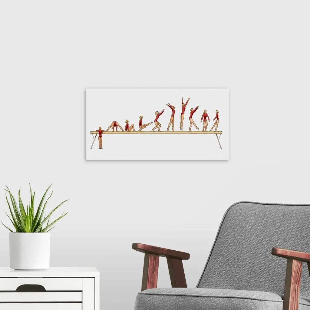 Sequence of illustrations showing female gymnasts competing on balance beam wall art for home and office decor. Discover canvas art prints, photos, mural, big canvas art and framed wall art in GreatBigCanvas.com's varied collections.