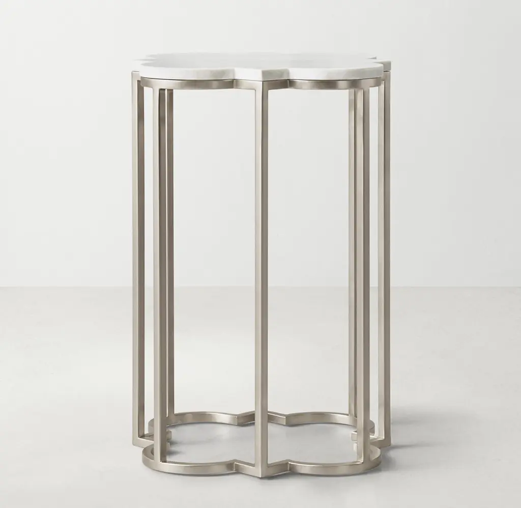 The exquisite geometry of our table is reminiscent of Art Deco design. The tabletop's luxe marble slab, hewn into an elegant quatrefoil, is set atop a precisely fabricated metal frame.