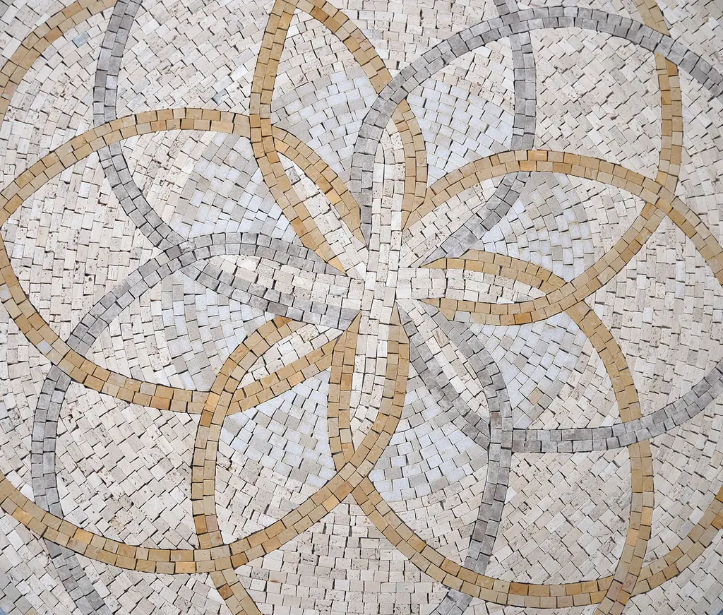 A circular stone mosaic medallion that showcases a captivating geometric design that evokes a sense of tranquility. The intricate pattern features a delicate interplay of light and dark tones, creating a mesmerizing visual rhythm. The central motif, reminiscent of a flower or a star, draws the eye inward, inviting contemplation and appreciation of the intricate details. This elegant mosaic medallion is a perfect addition to any space seeking a touch of sophistication and serenity.