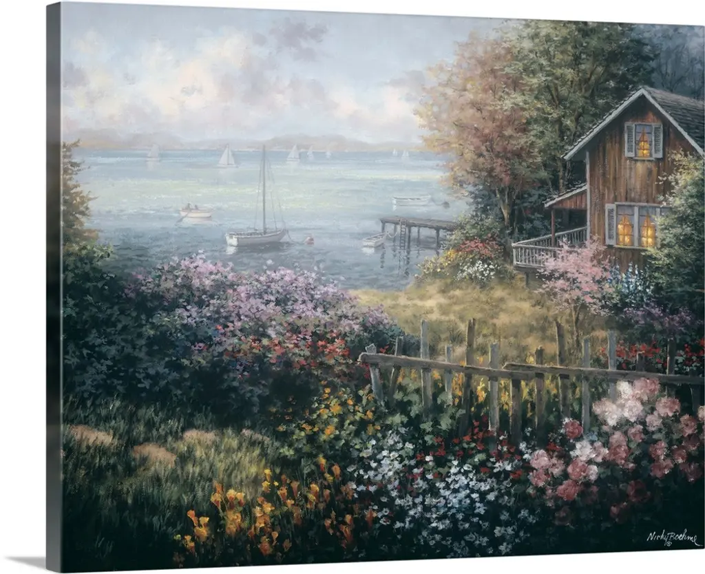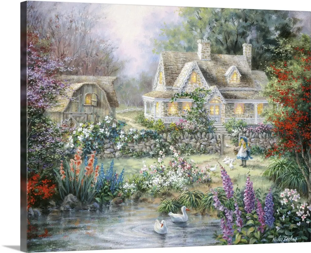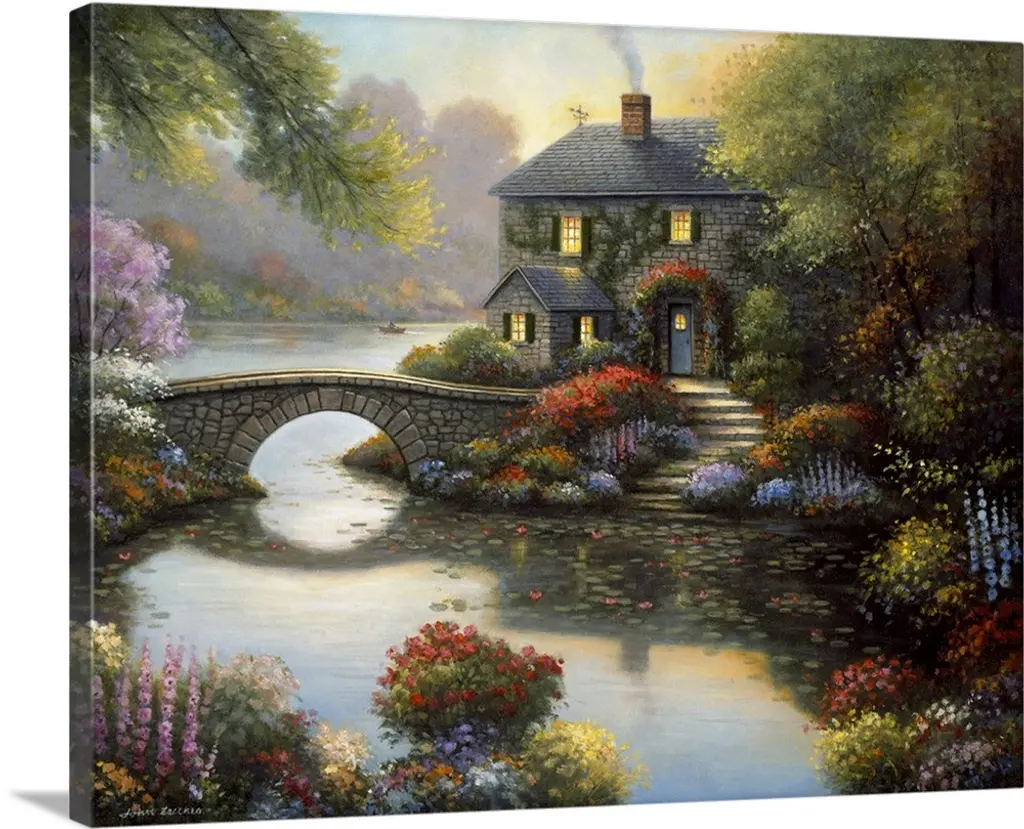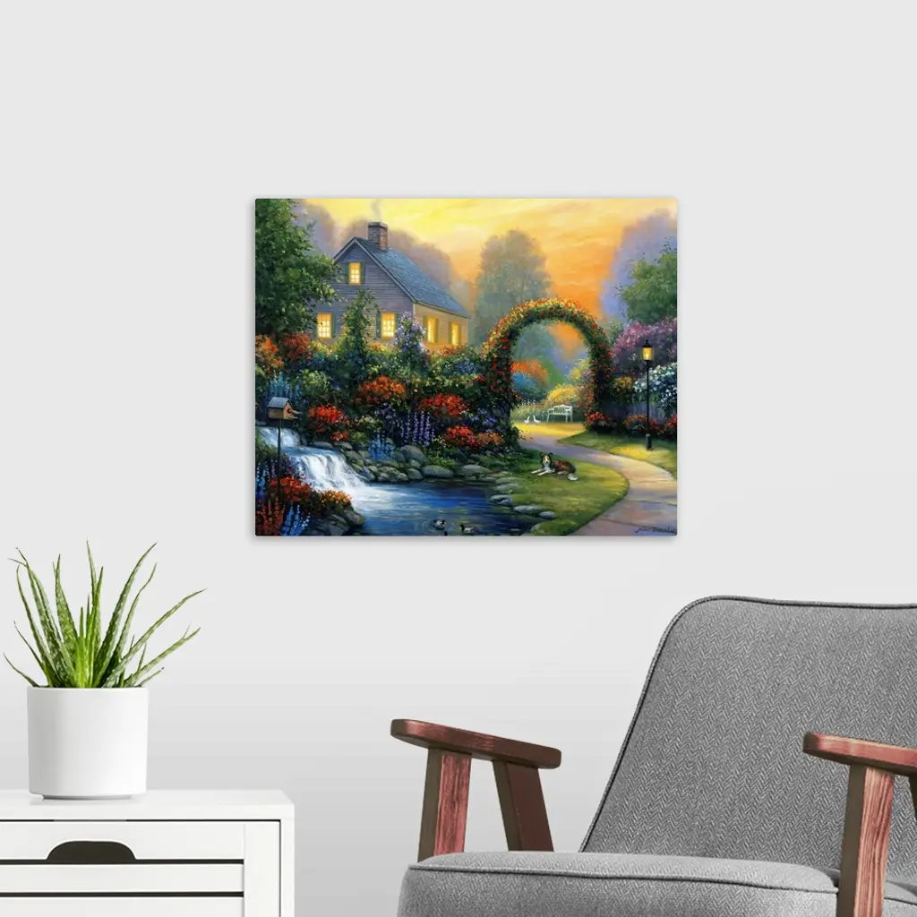 cottage at dusk, surrounded by colorful flower gardens, a stream w/waterfall and a collie in the grassspring