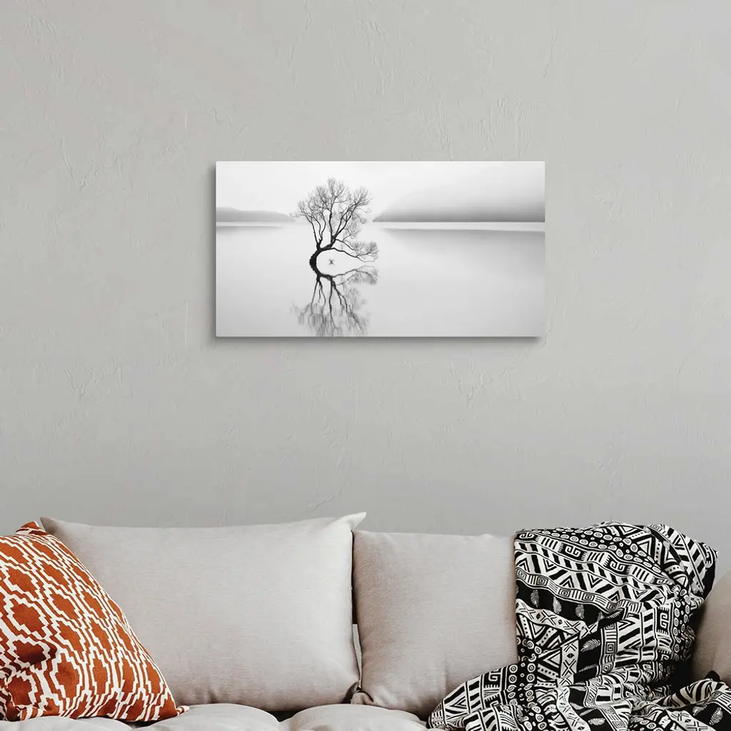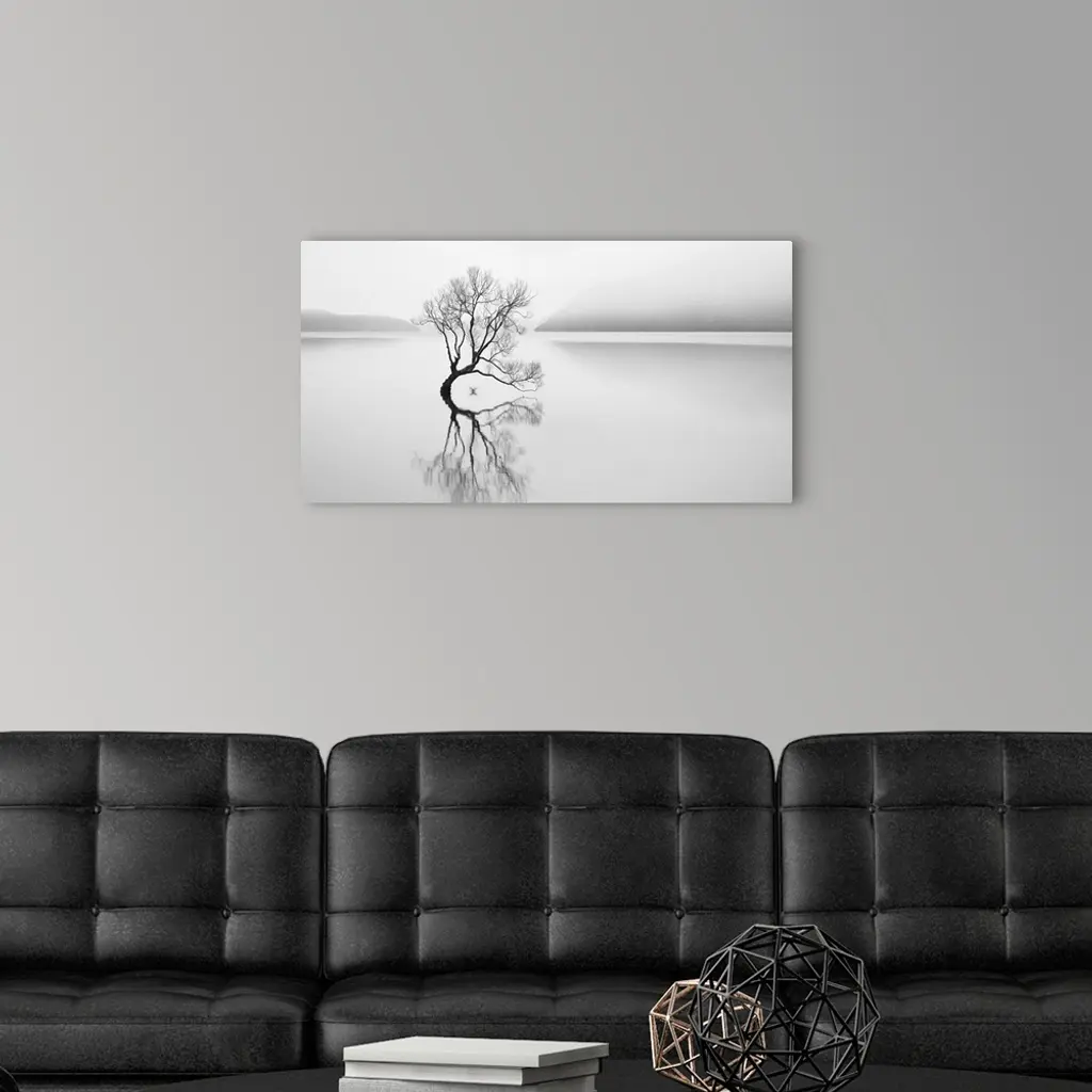 A tree with bare branches submerged in a lake, with its mirror image reflecting in the water.