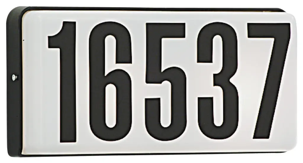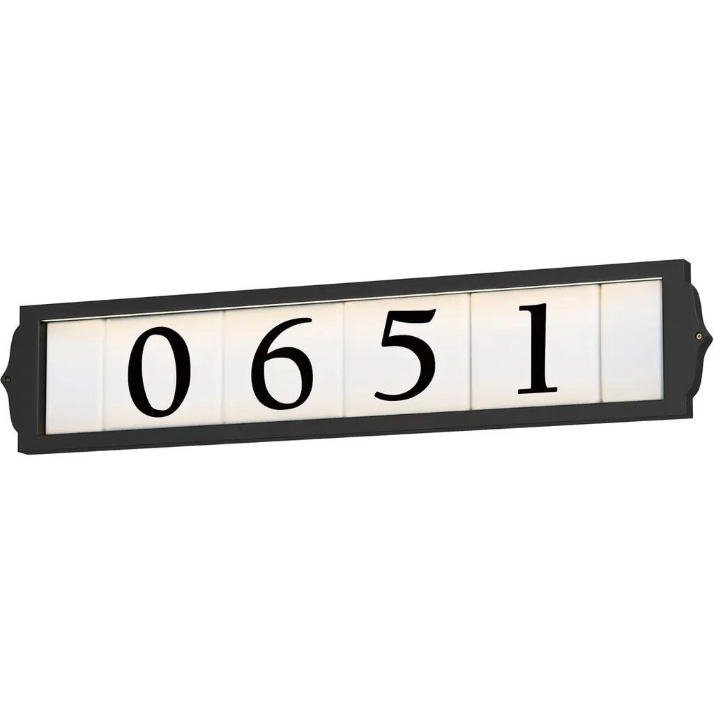 Serrano (Xtra Large) Lighted Address Plaque With Led Lights (Black Frame Only)Serrano (XTRA LARGE) lighted address plaque with LED lights features a galvanized steel frame with a tough black color powder coat finish. LED lights give a whiter and brighter look when lite up at night. Plaque can be seen up to 100 feet away at night and fits up to five 6" black vinyl numbers. Low voltage, plaque runs approx 18 volts and can plug into your existing doorbell transformer. LED bulbs ( are included with 3 feet of low voltage wiring. A low voltage hardwire or plug-in transformer are also available and sold separately.Dimensions: 14.5W x 2D x 7.5H in.Constructed of metalPowdered black finishExtra large lighted address plaqueIncludes 2 sets of numbers, adhesive glue, bulbs, and wiring
