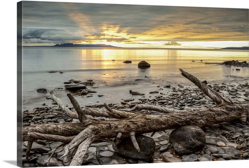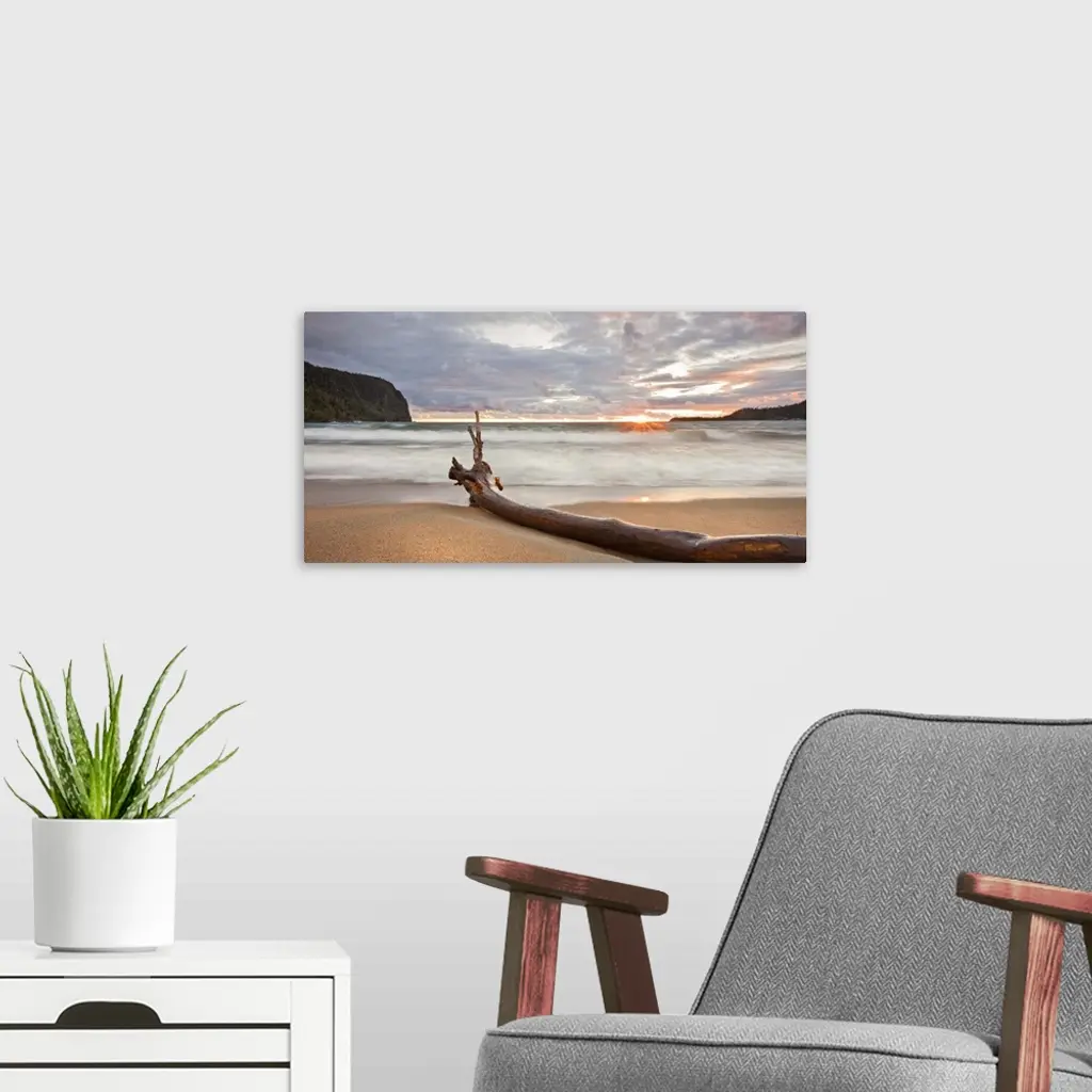 This landscape canvas is a sandy beach at sunset sheltered with steep rock faces; the composition of the photograph is divided with a slender tree trunk drift wood buried in the sand.