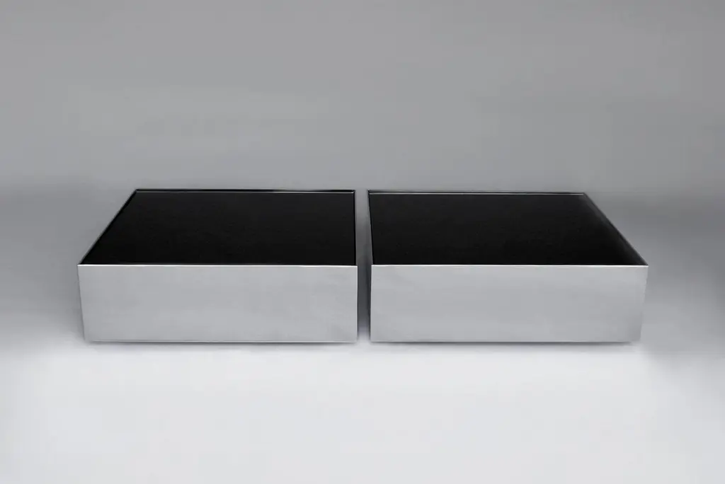 Set Of 2 Black Ice Coffee Tables by Phase DesignDimensions: D 76,2 x W 76,2 x H 25,4 cm.Materials: Spandrel glass and polished chrome metal.Steel coffee table with spandrel glass top. Available in polished chrome or powder coat finish. Prices may vary. Please contact us.The black ice ballot box invokes the spirit of minimalist artist Donald Judd. Crisp lines unify to create a steel box with a sleek sunken spandrel glass top. The table is constructed out of steel and finished with chrome plating or powder coating.Autodidact award-winning designer Reza Feiz has always been drawn to the strength in simplicity. Lured to Southern California by its inventive, creative spirit, he quickly discovered his true calling among the vast community of creators and artisans whose skills and ingenuity expertly transform imagination into reality.Inspired by Los Angeles’ iconic landscape and the compelling beauty of the places and spaces he encountered, he envisioned furniture, lighting and tabletop accessories, fabricating them from contemporary materials with the help of a tightly knit coterie of craftspeople.The resulting restrained yet revolutionary pieces have garnered enthusiasm from an international audience.He’s been lauded as “An American designer who influences world design”, a “Style Pioneer” and “One of a group of select young designers who represent the leading edge of discovery in design.” Architectural Digest’s Mayer Rus noted that his “wide-ranging collections make a strong case for the enduring appeal of restrained modern design.” Surface Magazine raved that he “imbues his work with a 21st-century edge. His astute sense of restraint keeps the designs relevant in a constantly evolving industry, without needing to subscribe to trends.”“Reza Feiz imbues his work with a 21st-century edge. His astute sense of restraint keeps the designs relevant in a constantly evolving industry, without needing to subscribe to trends.”
