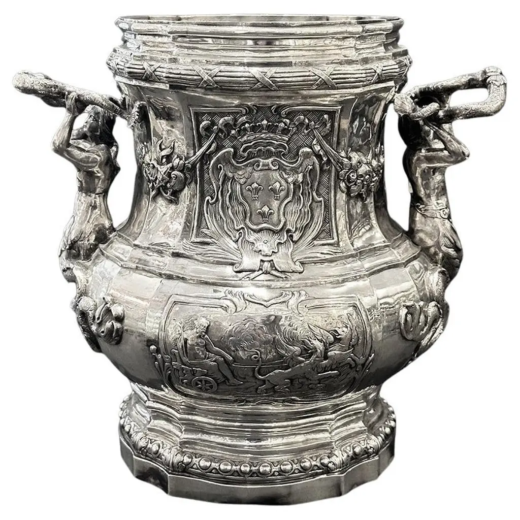This set of two bronze goblets is an accurate reproduction of ancient Roman silver glasses found in the ruins of Pompei and now on display at the National Archeological Museum of Naples. These elegant pieces feature a splendid bas relief depicting a female and a male centaur covered with lion skin and each mounted by a child. The mythological creatures are exquisitely rendered among a bucolic scene of trees and statues and bring a timeless accent to any table.