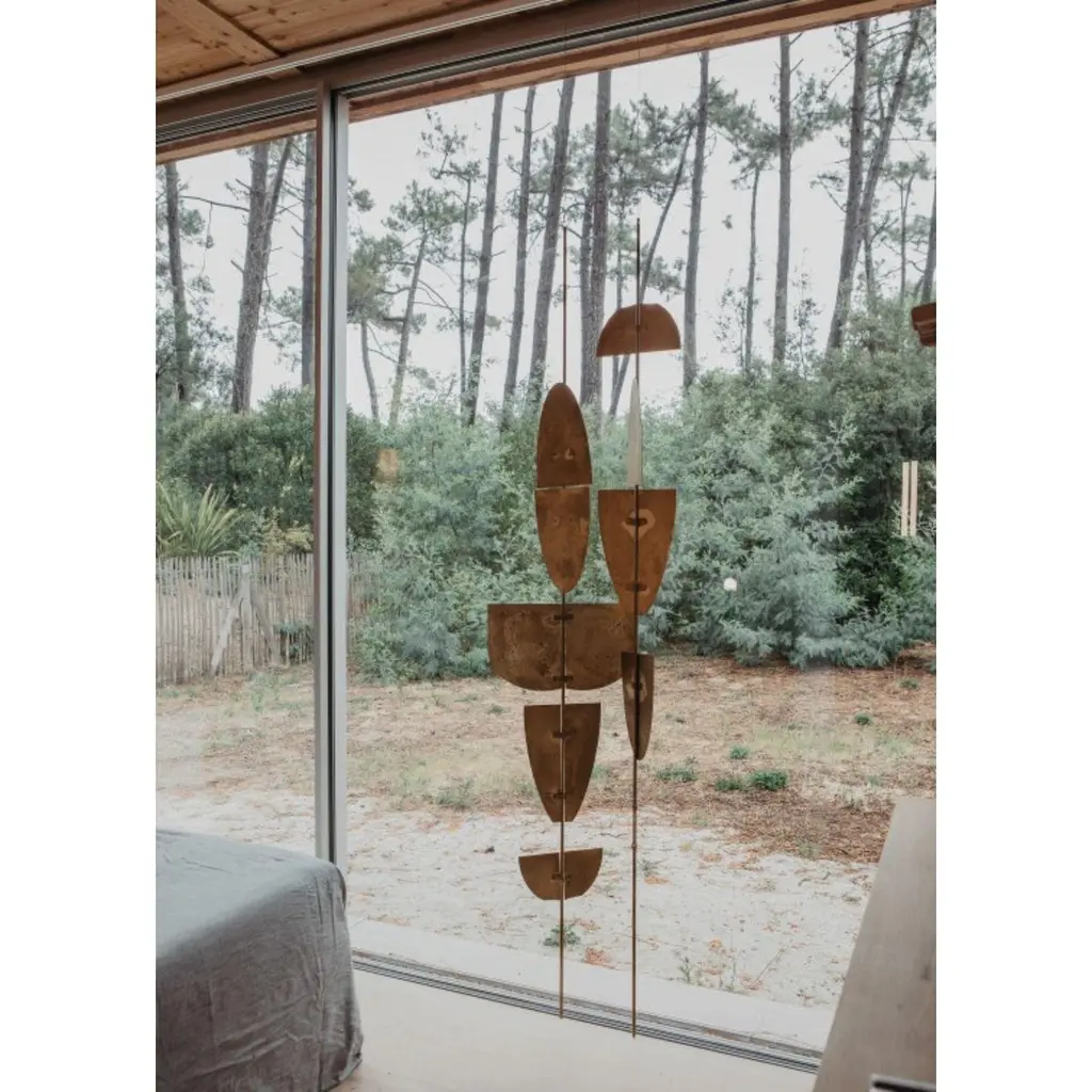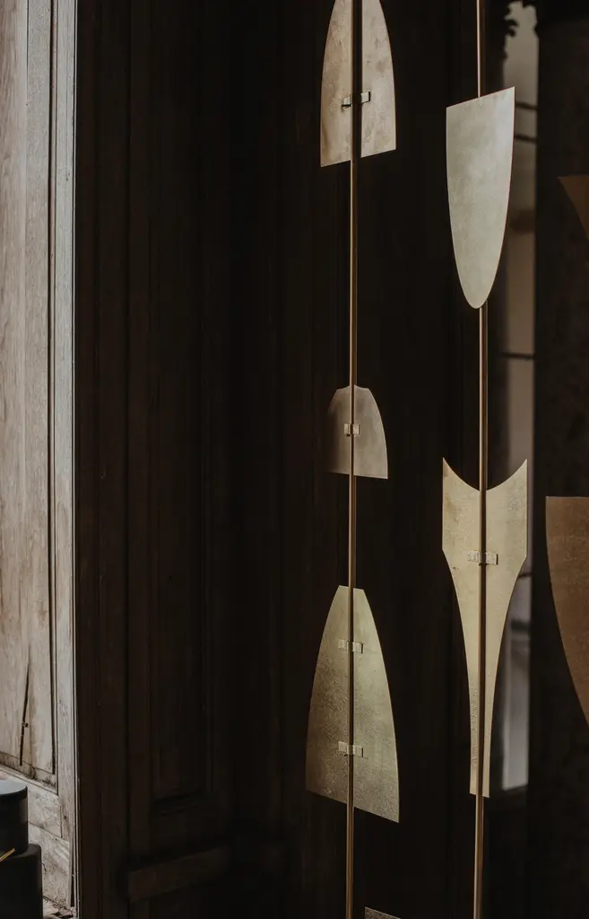 Set Of 2 Fixings Of Brass Shutters by Mylene NiedzialkowskiDimensions: W 40 x H 300 cm.Materials: Brass.Made from French brass, our brass shutters can be decorative as well as room dividers. Sold by the rod (adaptable to your ceiling height) with 5 modules to choose from. The brass rod adapts to your ceiling height. Ceiling hanger provided. Possibility of adding floor and ceiling mounting modules and having your brass rod cut on request. The modules are 20cm wide for the largest (or 40cm wide if two large modules are combined face to face). The elements of the brass shutters are mounted at the Château de Méritein, our Béarnaise factory.All our collections start from an exploration, from a curiosity for the material, from the discovery of the gesture to work it, from the application to master it and finally, from the care to arrive at the object that you discover while browsing these pages. Georges adorns himself with rare fibers and raw materials to carefully manufacture, entirely by hand, sincere objects and other numbered masterpieces, always in a reasoned approach.All our objects and lights are handmade in our factory in Béarn, in Méritein. In this castle, our teams use simple and raw materials sourced as close as possible and transformed on site. A manufacturing process that is economical in resources, generous in know-how and respectful of the environment.At the basis of each object, there is a permanent desire to experiment. To understand matter, its constraints, its properties. And to transform it, taking care to only work on it as minimally as possible.From this desire to leave the raw material as raw as possible, Mylene Niedzialkowski draws and designs pieces with minimal lines, with singular and assertive irregularities.Sailing between the South West of France and Paris, fascinated by arte povera and popular arts, Mylene Niedzialkowski strives to accumulate local raw materials in her workshop, from neighboring regions, basic and common materials, ordinary and daily, both household and industrial or even from production residues. From this collection which oscillates between material library and cabinet of curiosities, simple objects with clean lines are created, sometimes everyday, sometimes with an essentially decorative function.