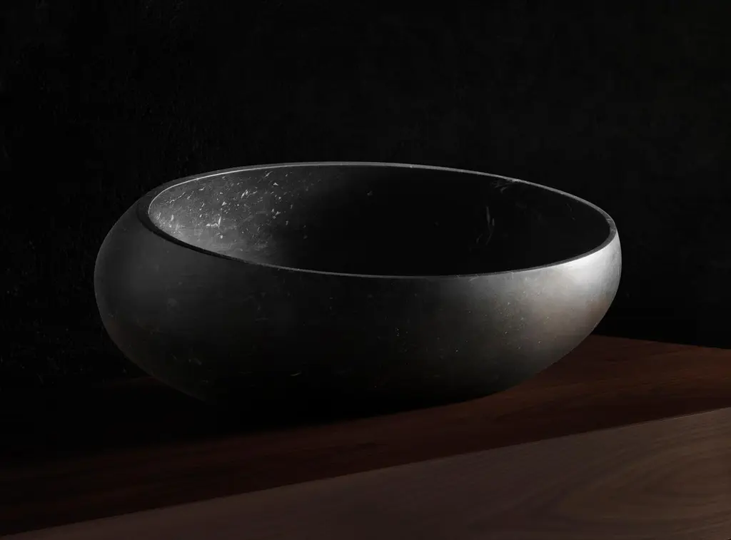 Set Of 2 Gong Countertop Large Basins by Kreoo Designed by Christophe PilletDimensions: D 50 x W 80 x H 33 cm.Materials: Nero Marquina marble.Weight: 60 kg.Available in different marble and travertine options. Available in two different sizes. Please contact us.The softness of pebbles worked by the action of water inspires the aesthetics of the Gong collection, which includes freestanding and countertop washbasins where marble fully expresses its value and natural background.The ellipsoidal shape of the bowl, in two sizes for both versions, emphasizes the nuances of the material, which can be chosen from the ten proposals in the catalogue, while the diagonal cut of the volume gives it a unique and distinctive design.The result is an oval carved out with a meticulous and extremely fine technique, whose internal surface can also be realized in contrasting colours, with a materic and precious coating in different colours.Kreoo: the new marble experienceKreoo links its name to the best Italian tradition in marble manufacturing and brings to new light the primordial charm of a material that has witnessed the evolution of civilizations and cultures.From the bathroom and living room to coverings, home accessories, and lamps, the company works with natural stone in various forms and aesthetic compositions, enriching it with other materials such as metals, wood, and glass. The result is a fascinating and chromatic language, suitable both indoors and outdoors. Expressed in contemporary but still customizable designs, Kreoo highlights workmanship know-how and excellence.The brand, born in 2010 by the experience of Decormarmi and its worldwide distribution strength, has led to major international projects, especially in hospitality and luxury residential.