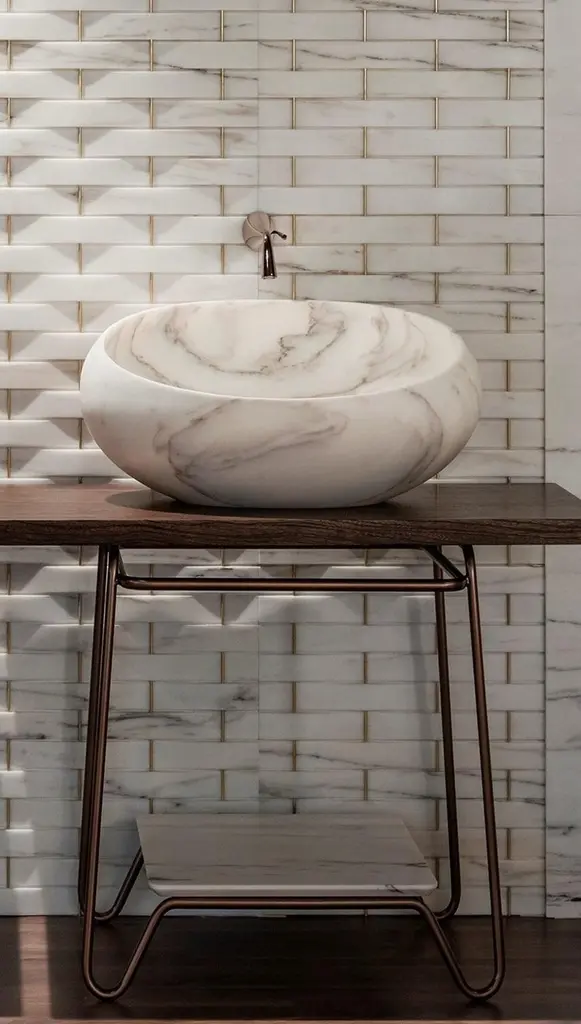 Set Of 2 Gong Countertop Large Basins by KreooDesigned by Christophe PilletDimensions: D 50 x W 80 x H 33 cm.Materials: Bianco Del Re marble and silver leaf.Weight: 60 kg.Available in different marble and travertine options. Available in two different sizes. Please contact us.The softness of pebbles worked by the action of water inspires the aesthetics of the Gong collection, which includes freestanding and countertop washbasins where marble fully expresses its value and natural background.The ellipsoidal shape of the bowl, in two sizes for both versions, emphasizes the nuances of the material, which can be chosen from the ten proposals in the catalogue, while the diagonal cut of the volume gives it a unique and distinctive design.The result is an oval carved out with a meticulous and extremely fine technique, whose internal surface can also be realized in contrasting colours, with a materic and precious coating in different colours.Kreoo: the new marble experienceKreoo links its name to the best Italian tradition in marble manufacturing and brings to new light the primordial charm of a material that has witnessed the evolution of civilizations and cultures.From the bathroom and living room to coverings, home accessories, and lamps, the company works with natural stone in various forms and aesthetic compositions, enriching it with other materials such as metals, wood, and glass. The result is a fascinating and chromatic language, suitable both indoors and outdoors. Expressed in contemporary but still customizable designs, Kreoo highlights workmanship know-how and excellence.The brand, born in 2010 by the experience of Decormarmi and its worldwide distribution strength, has led to major international projects, especially in hospitality and luxury residential.