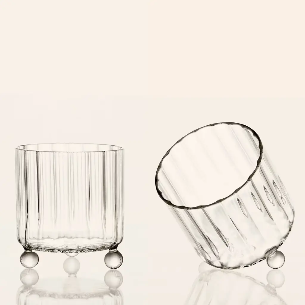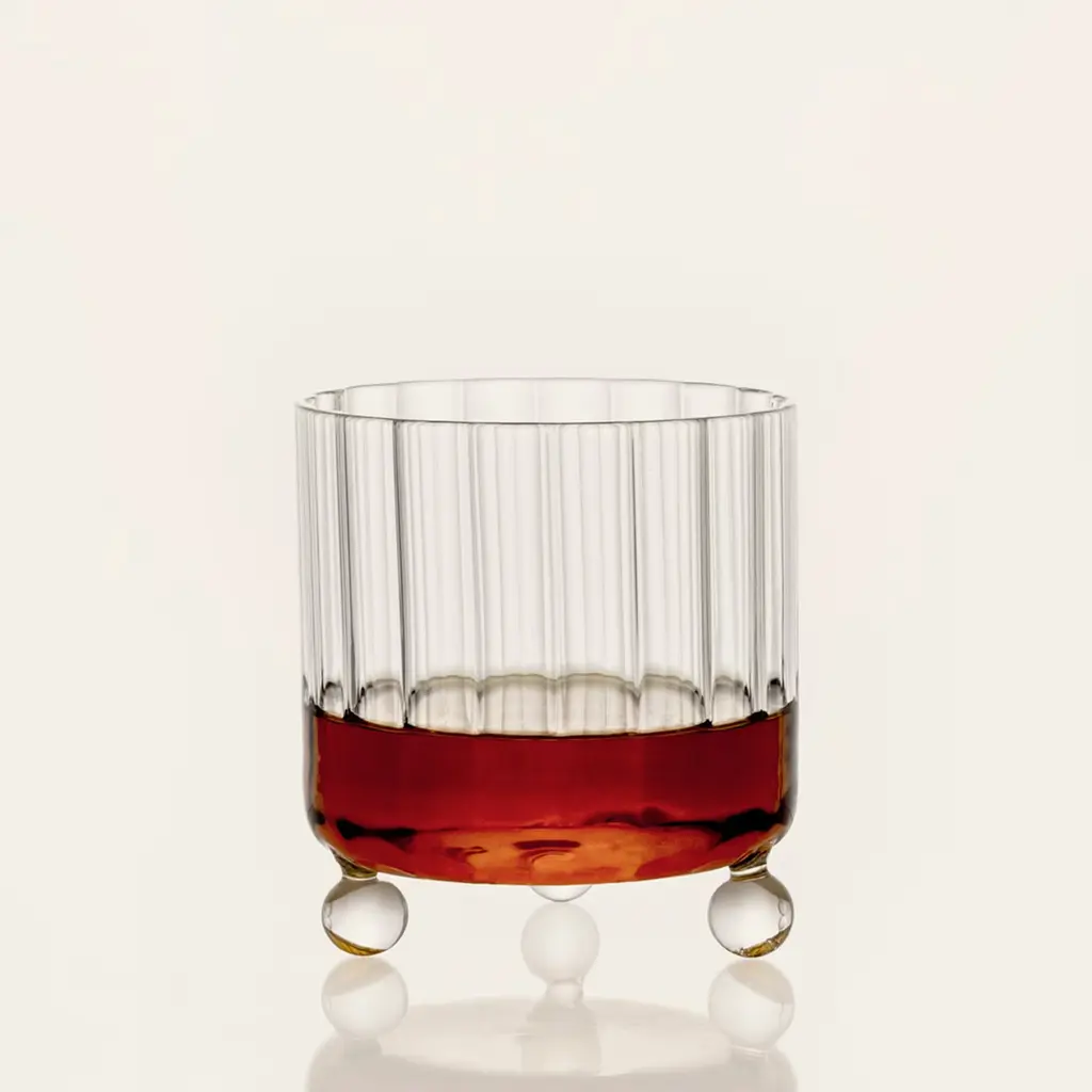 A lowball glass of an atypical shape, inspired by Postmodern architecture. Each piece is handmade in Italy by Master glassblowers, using high-quality borosilicate glass. The ribbed glass body rests on top of three clear spheres, playfully elevating any drink. The sculptural design allows for a tilting motion, that encourages appreciating beverages and spirits.