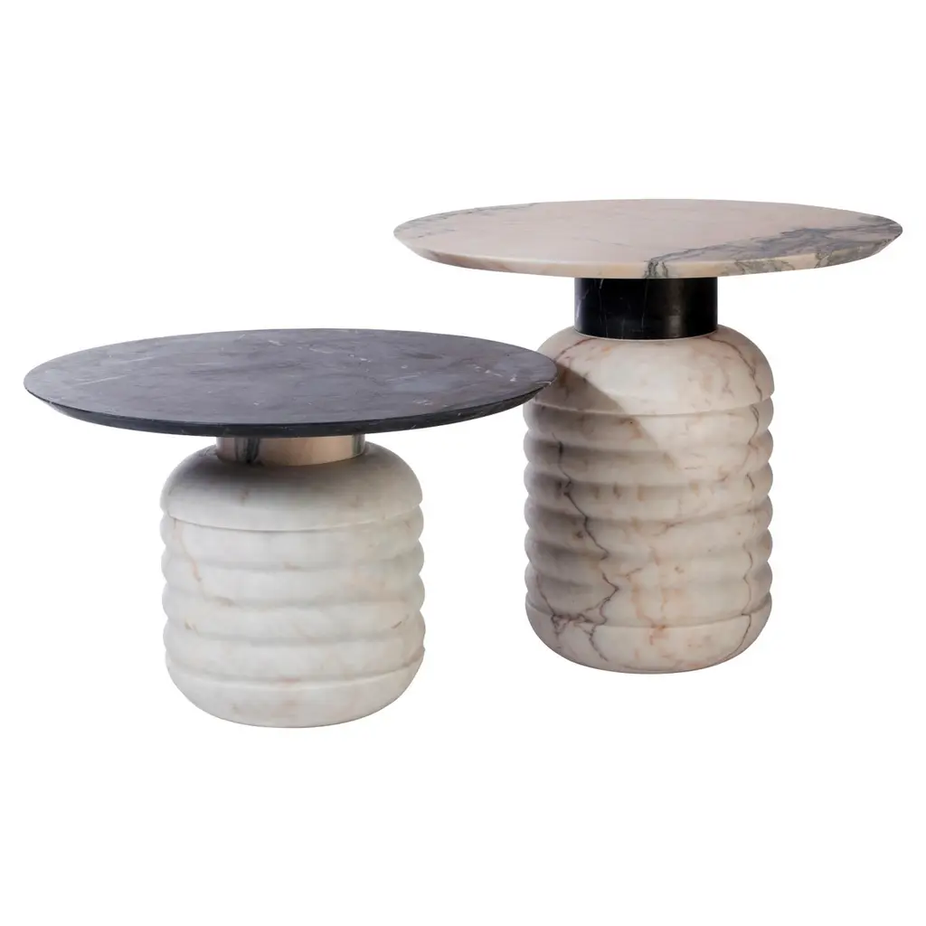 Set of 2 marble tables by Lisette RützouDimensions: D 60 x H 41 cmD 60 x H 41 cmMaterials: Marble tabletop, Brass Column Lisette Rützou’s design is motivated by an urge to articulate a story. Inspired by the beauty of materials, form and architecture, each design is an independent statement - contemporary functionalism with a feminine touch. Each piece tells an individual story – an embodiment of emotion ? “I hope with my design to create a reaction, a feeling beyond beauty and fine lines. To me - designing is personal – color, movement, sound and scale – a universal language essential to my approach.".