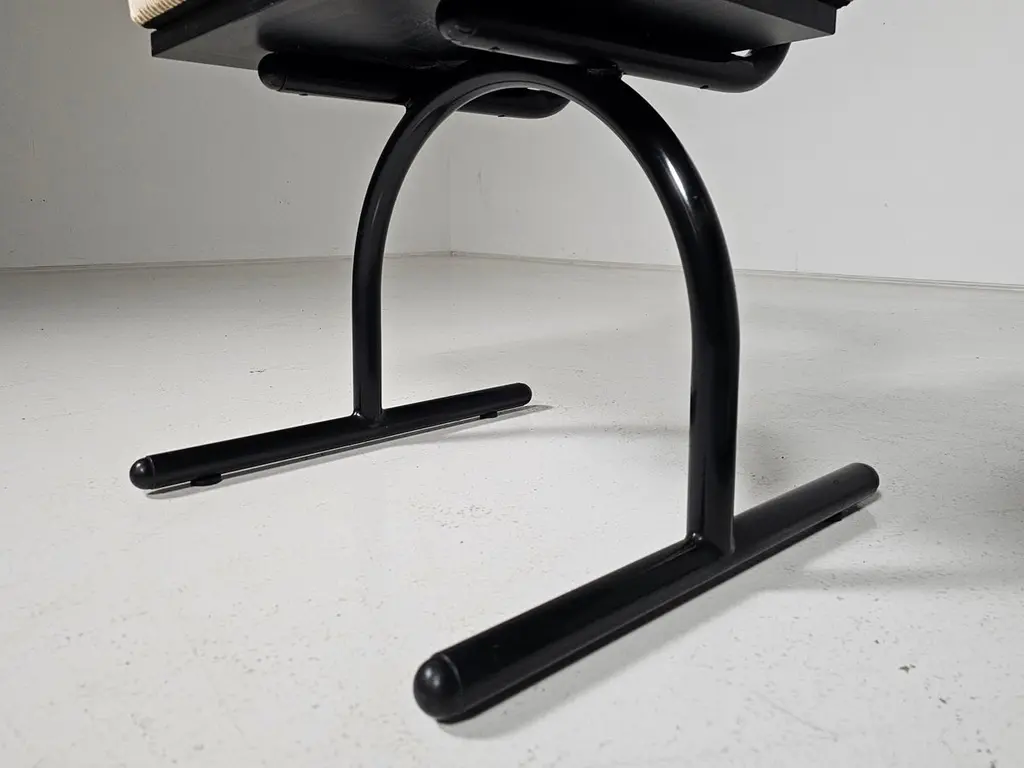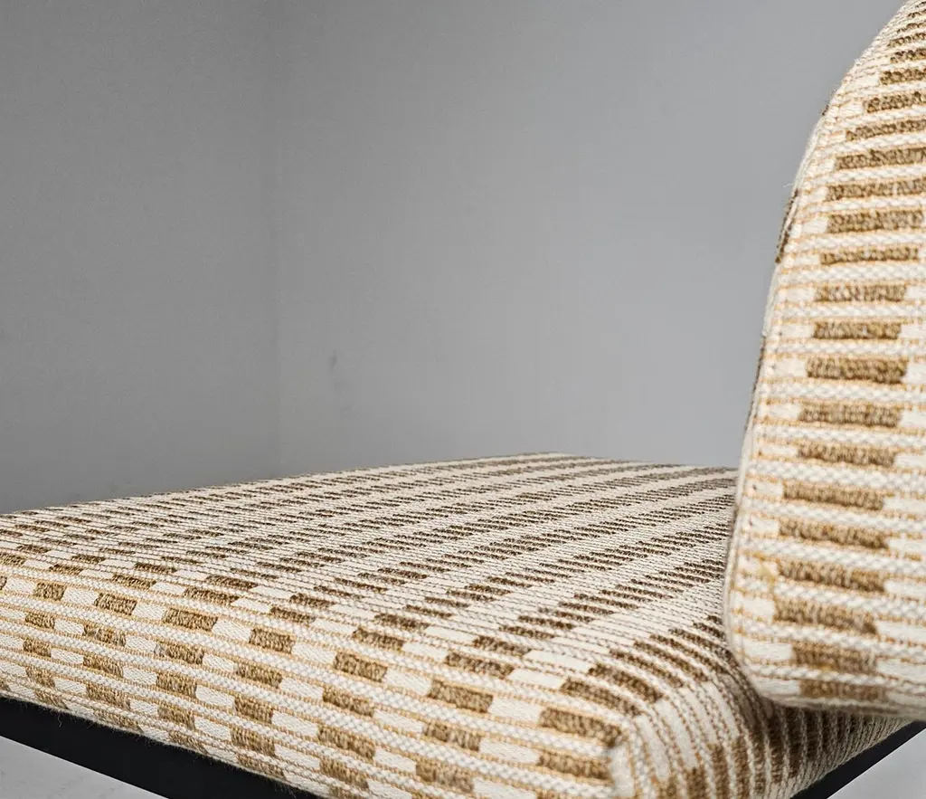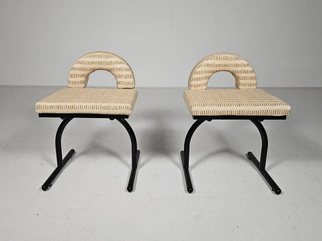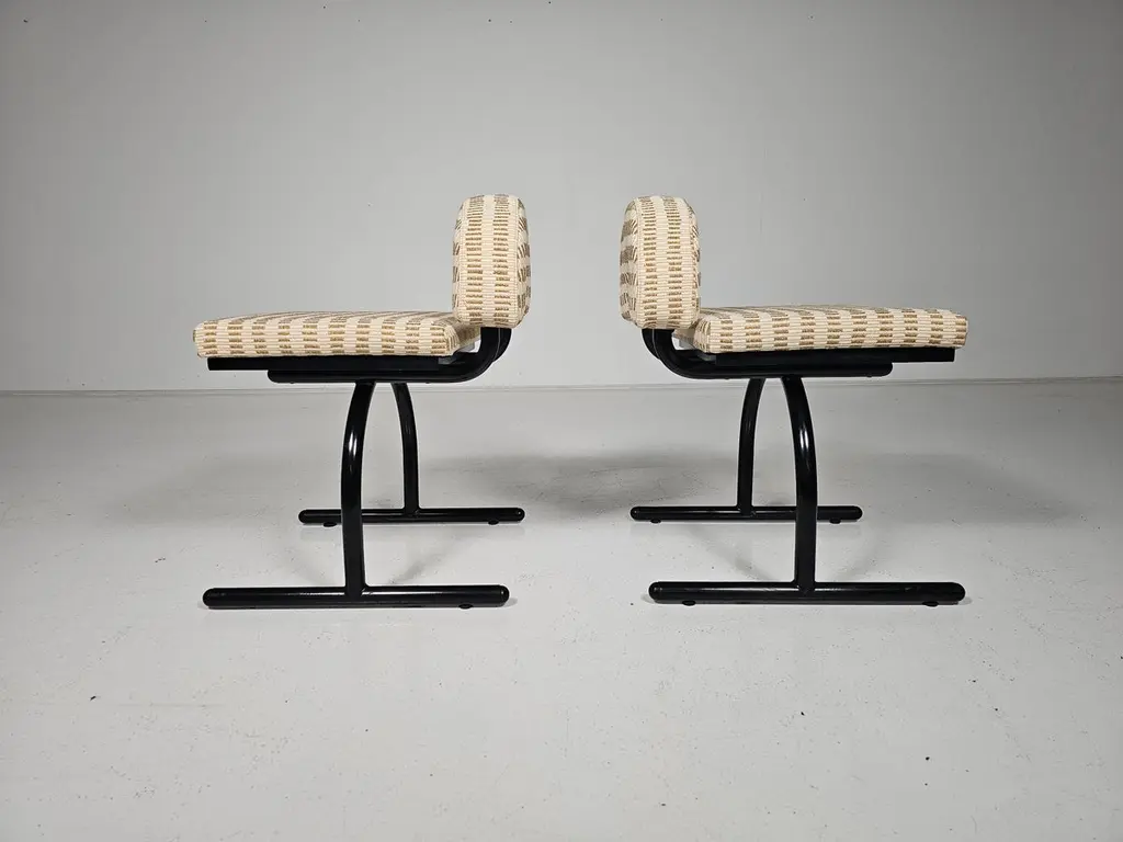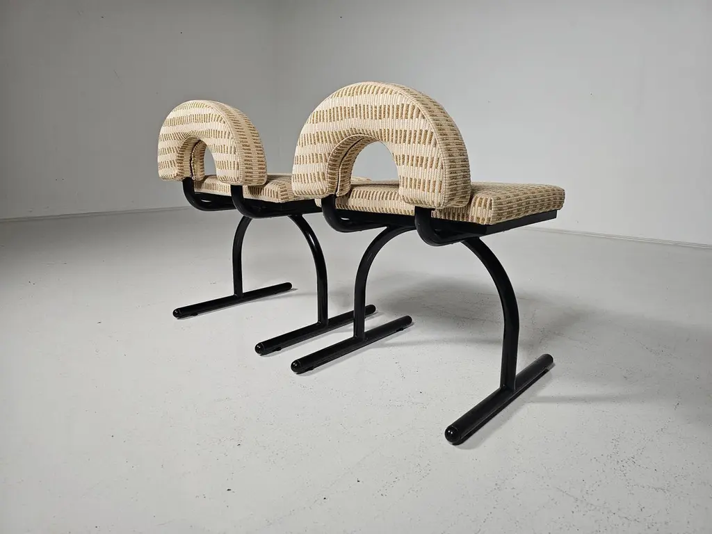 Rare set of two Memphis style chairs attributed to Saporiti from the 1980s,Constructed with a metal framework, these chairs ensure longevity and stability. The seats and backrests are reupholstered in a luxurious BAJA fabric by Kelly Waerstler. Adding a refined and sophisticated touch.Originating from Italy, these chairs reflect the innovative design and meticulous craftsmanship characteristic of Italian furniture from this era. The combination of industrial metal, and artistic fabric creates a harmonious and aesthetically pleasing balance.They are very comfortable. We have 4 sets available.