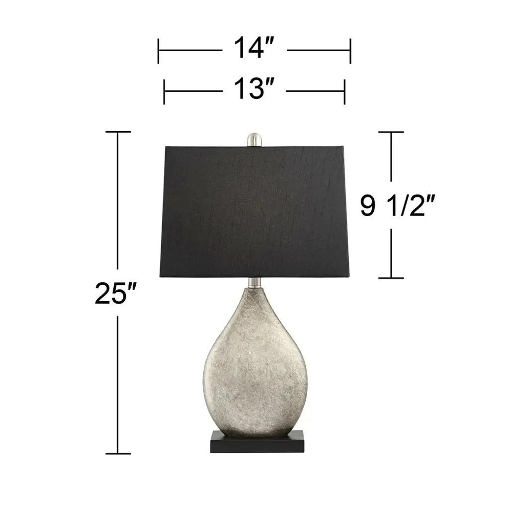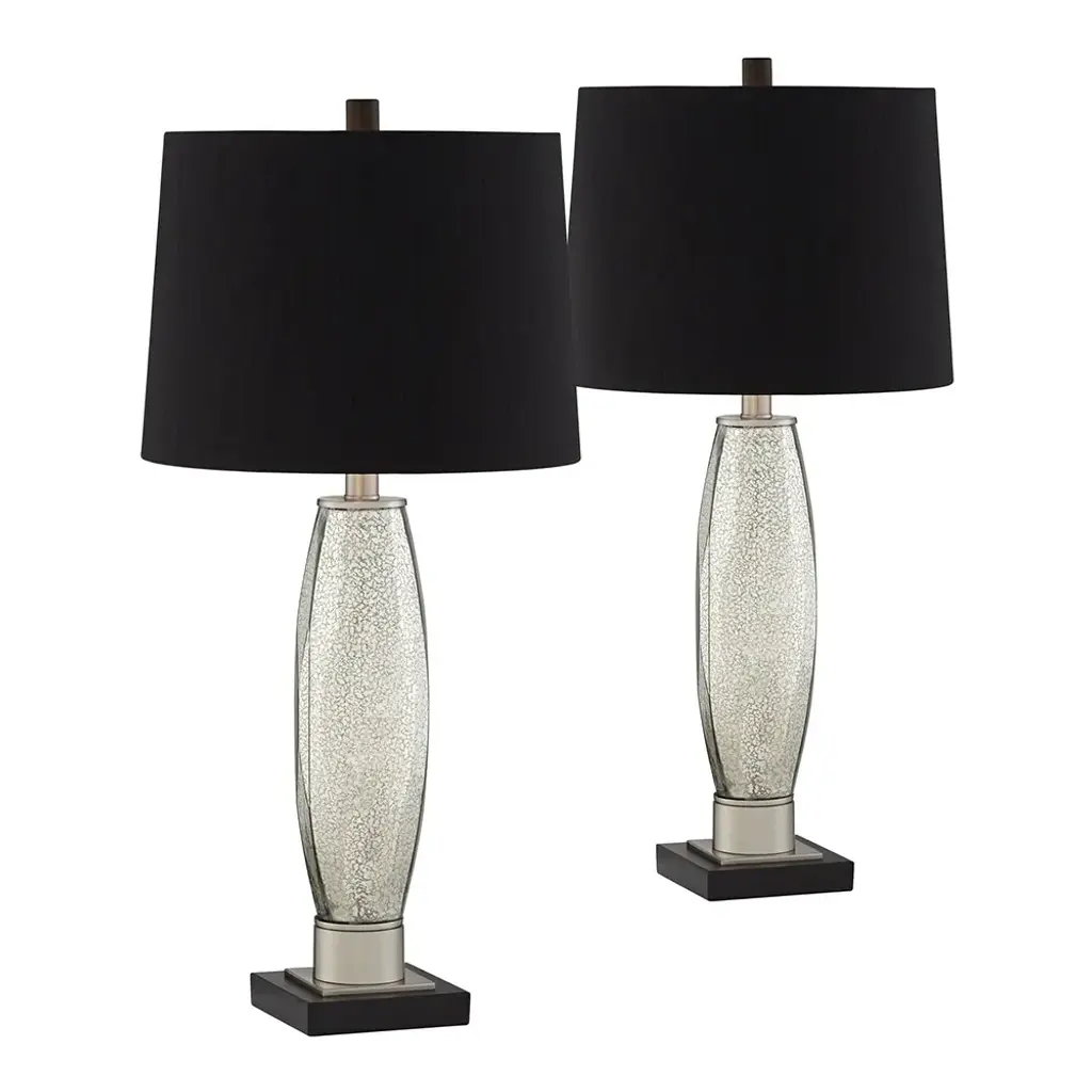 PRODUCT DETAILS: Set of 2 glass lamps. Each is 27 1/2" high overall. Shades are 11 1/2" across the top x 13" across the bottom x 9 1/2" high. Bottom bases are 5 1/2" square. Weigh 9.7 lbs. Each uses one maximum 150 watt standard-medium base bulb (not included). On-off switch on the socket. Set of two mercury glass table lamps. Modern luxe style from the Regency Hill brand. Mercury glass base construction. Black finish square resin pedestal at the very bottom of the lamp. Black fabric lamp shades. 8-foot long clear cords. DESCRIPTION: Create a cohesive look in your home with this stunning pair of table lamps. Sporting a spectacular mercury glass construction, each lamp comes with a sleek black shade. A design from the Regency Hill brand.