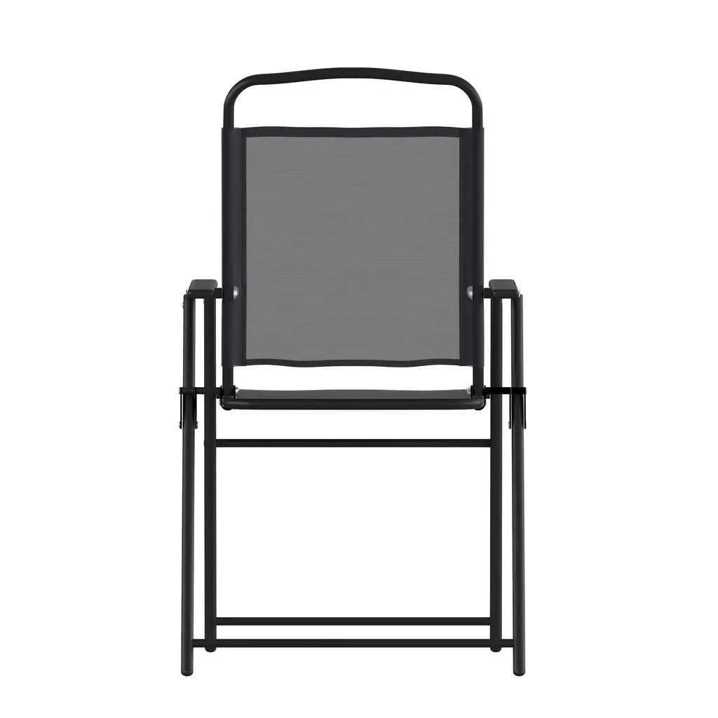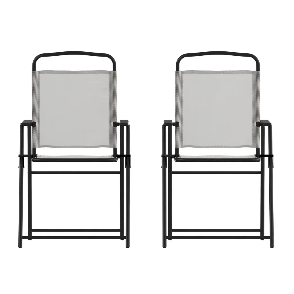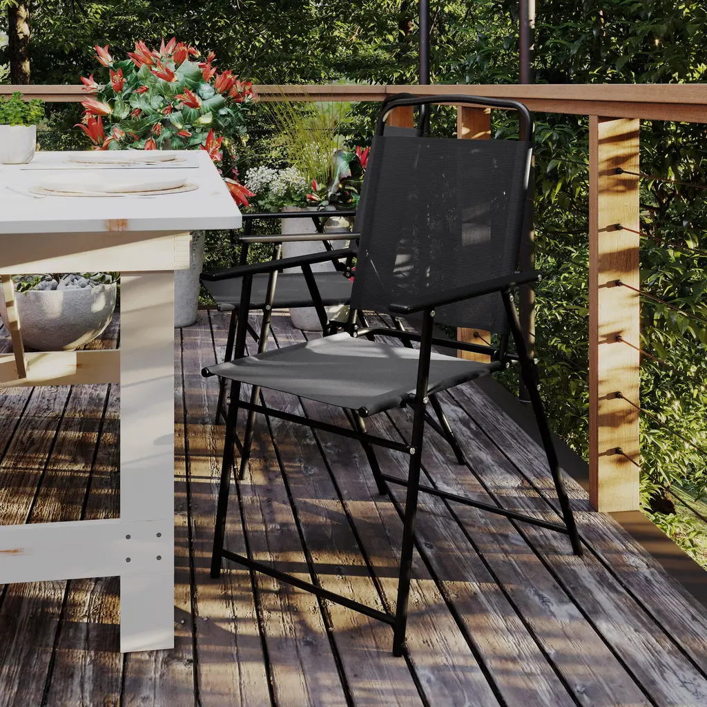 Relax and enjoy your outdoor leisure time with this set of 2 patio sling chairs with armrests. Breathable textilene fabric allows for airflow to keep you cool and is quick drying making these chairs ideal for use outside. Designed to stand up to the elements, these patio chairs are UV fade and weather resistant and boast powder coated rust-resistant steel frames that hold up to 350 lbs. static weight per chair. Protective floor glides prevent damage to indoor flooring surfaces and the lightweight, foldable design allows for easy storage and portability so you can take them along to your favorite locations. These chairs arrive ready for use right out of the box and cleanup is quick and easy with a damp cloth, perfect for busy households. Purchase several sets in multiple colors to complete your indoor or outdoor setup.