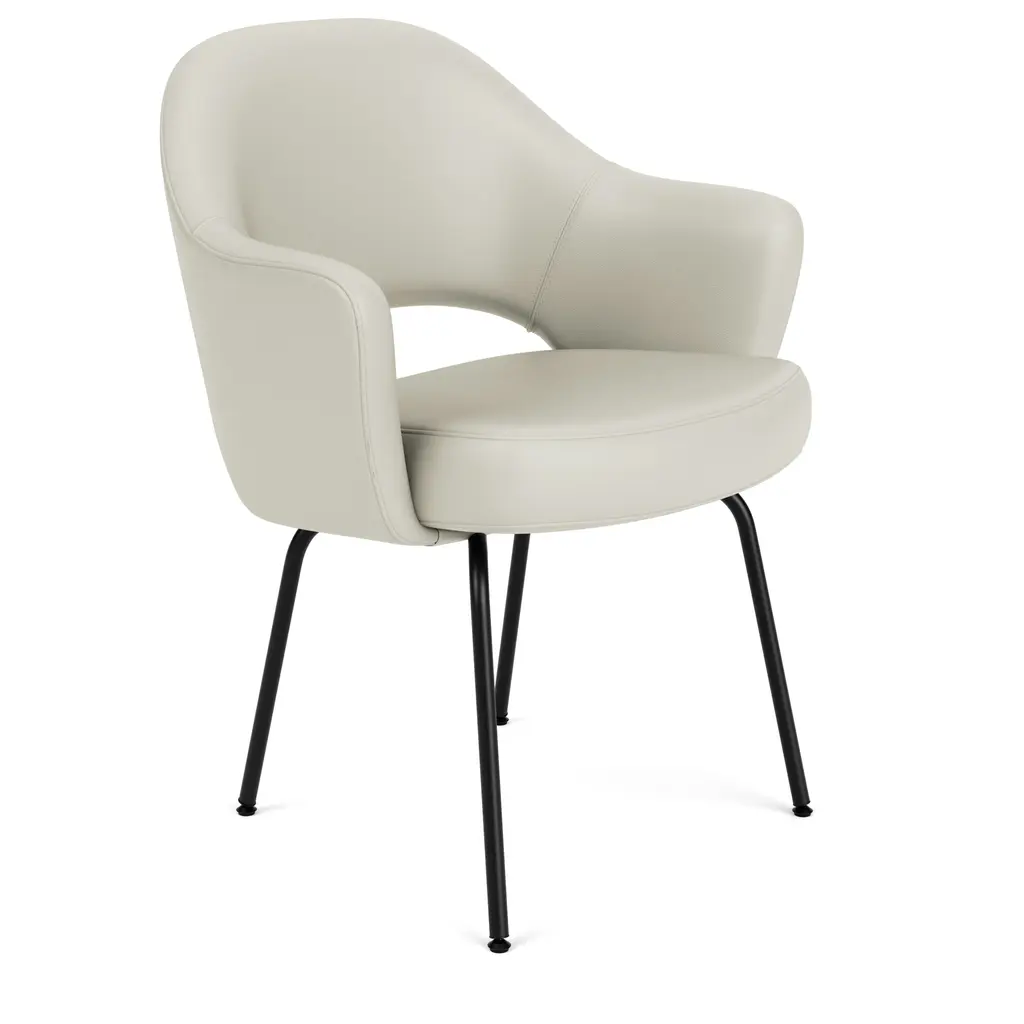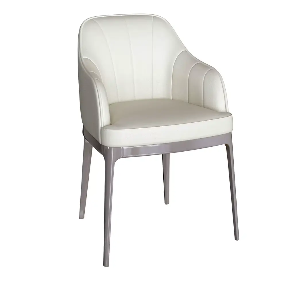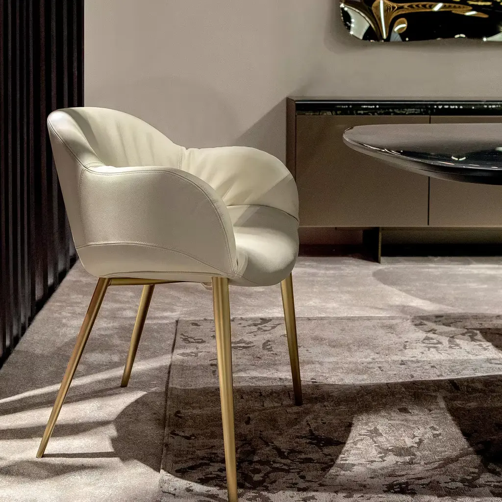 Sleek lines and sinuous curves stand in impeccable harmony in this elegant armchair, designed and conceived with comfort and refinement in mind. Graceful golden-finished metal legs sustain the enveloping seat, its backrest's profiles sloping to incorporate the likewise sinuous armrests. Padded with memory foam and upholstered with fine beige leather, it ensures perfect comfort.