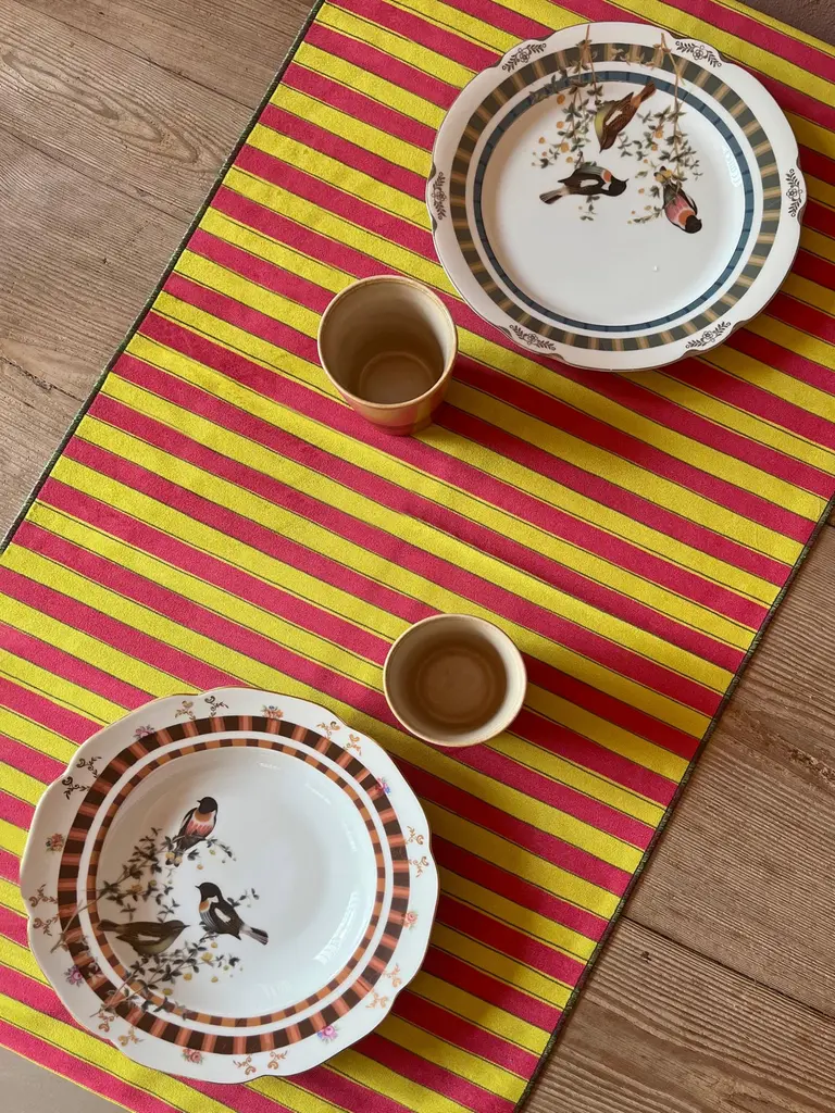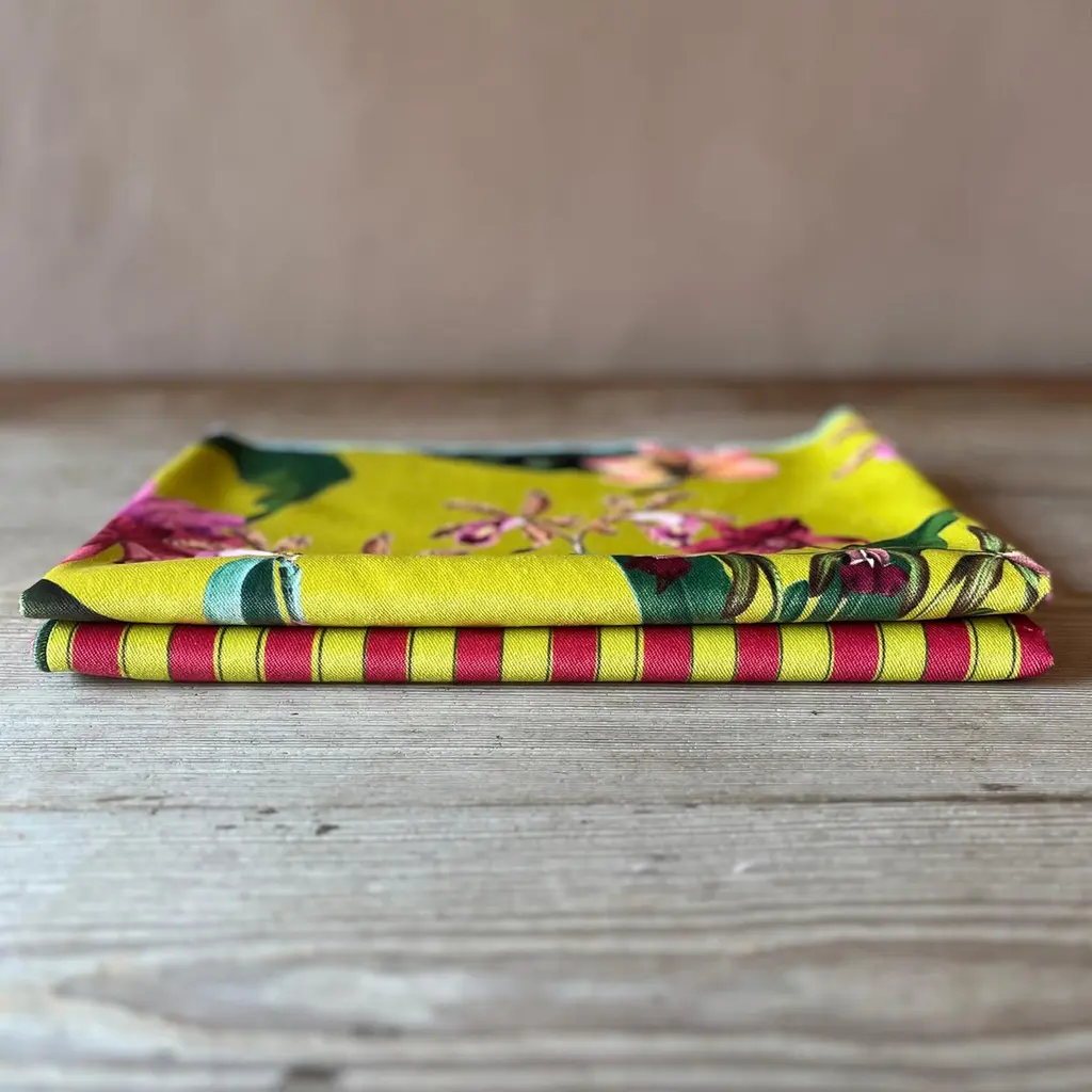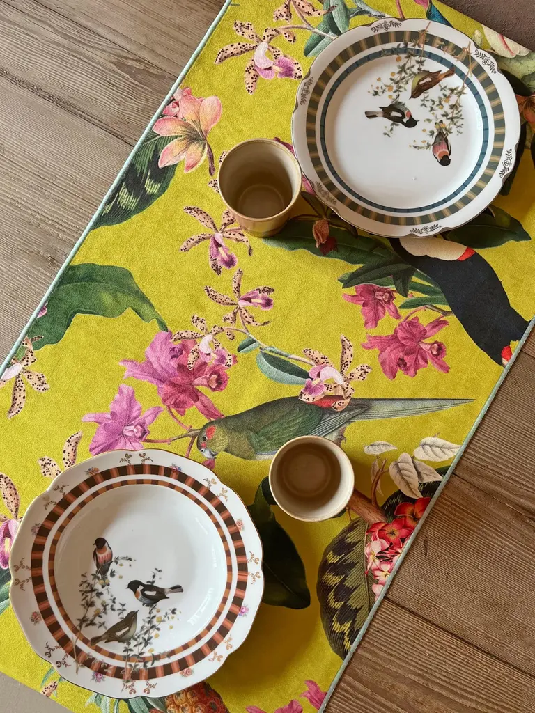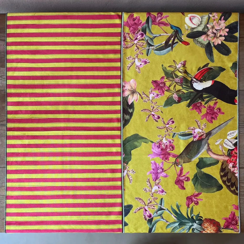 Add a touch of elegance and practicality to your table with our Polyester Velvet Runners, an expression of Italian craftsmanship. Measuring 45x140 cm, they offer a splash of color to the table thanks to the refined pattern inspired by the nature of Brazil on a yellow background, paired with a refined yellow and fuchsia striped pattern. This Runner can be machine washed at 30°C and does not require ironing, providing great convenience. Each piece is printed and handcrafted in Italy, ensuring quality and attention to detail.Perfect for any occasion, from everyday to more formal dinners, it combines elegance and practicality.Available in different color combinations and patterns to suit your unique style.