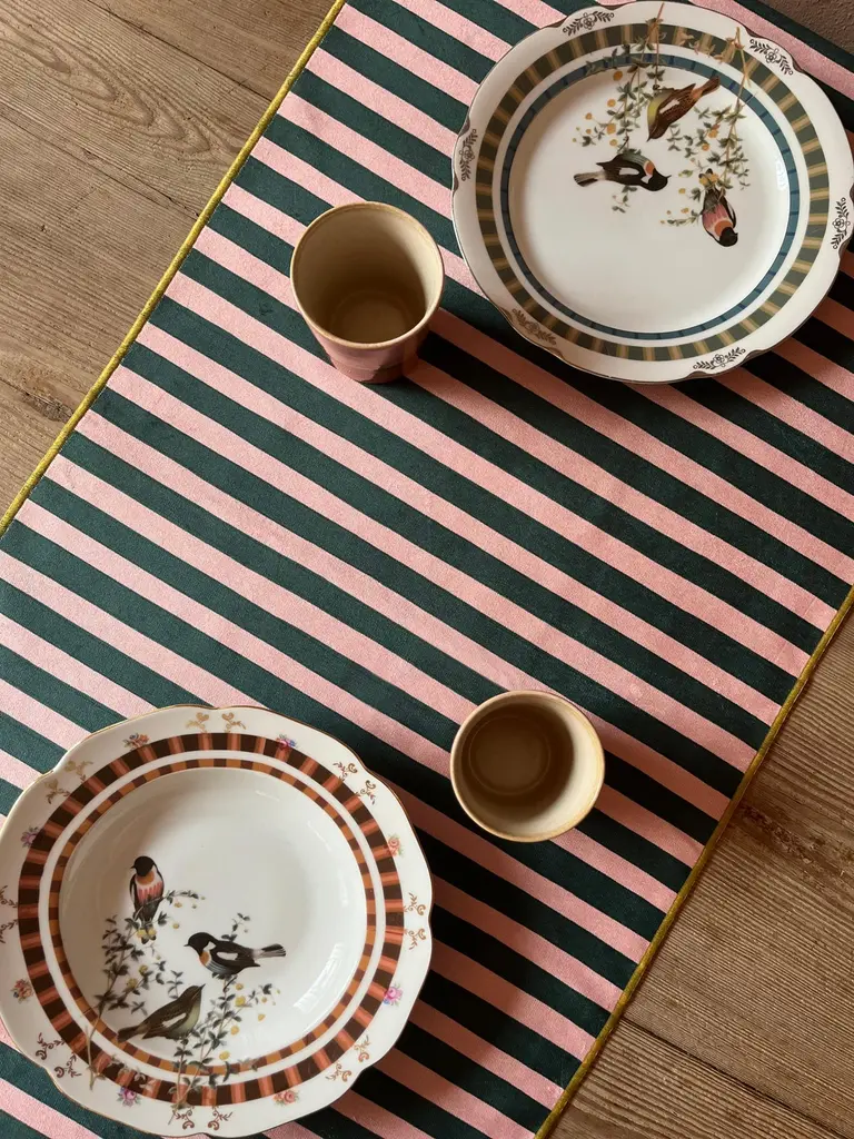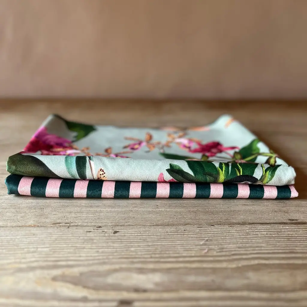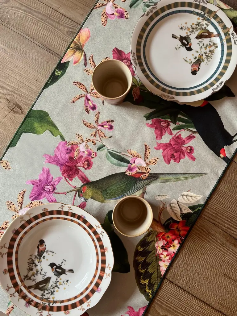 Add a touch of elegance and practicality to your table with our Polyester Velvet Runners, an expression of Italian craftsmanship. Measuring 45x140 cm, they offer a splash of color to the mise en place thanks to the refined pattern inspired by the nature of Brazil on a teal background, paired with a refined green and pink striped pattern. This Runner can be machine washed at 30°C and does not require ironing, providing great convenience. Each piece is printed and handcrafted in Italy, ensuring quality and attention to detail.Perfect for any occasion, from everyday to more formal dinners, it combines elegance and practicality.Available in different color combinations and patterns to suit your unique style.