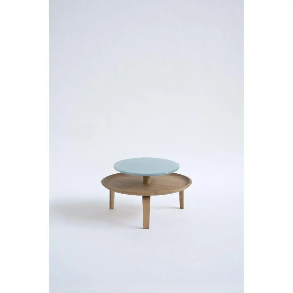 Set of 2, Secreto 60 coffee tables, Azure “Cypre” by Colé ItaliaDimensions: H.32; base plate ø 60 top ø 45 cmMaterials: Coach table with 2 rounded plates; 3 legs and base plate in natural solid oak;top matt lacquered in 5 colors.Also available: Different colors, Secreto 80, & Lacquered legs (custom color)It comes from the idea of transforming the traditional coffee table, usually overflowing with books, magazines and newspapers, in a ‘coffee table / book table’, where there is really space both for books and for the cups! The upper shelf is enriched with evocative colours taken from fine perfume’s labels of the 20s and 30s. Three legs in solid oak wood, natural or black stained. Lower plate in solid oak, Top lacquered in off- white, off- black, ochre yellow, spicy orange and sky blue.Colé is a young Italian design brand, with a high-end production 100% made in Italy. Born from the experience of Matteo De Ponti, architect, who grew up in one of the most outstanding Milanese design families, and the artistic sensibility of Laura Macagno, degree in Economics and passionate of art and design. Our Mission is to create design icons, beautiful and comfortable pieces that can Stand the test of time, furnishing houses of international and sophisticated clients, and realized with craftsmanship, thus unique. “We love objects which own deep roots, excellent quality, and a strong evocative power. Archetypal forms dressed with new beauty without losing their classical composure”.Our expressive research is inspired by the utopian force of Italian eminences grises architects and designers of the ’50s, the Scandinavian design, the Bauhaus, ethnic handcraft and houses of famous writers of the XX century, all different as a style but united by the intense soul of those who worked and lived there.