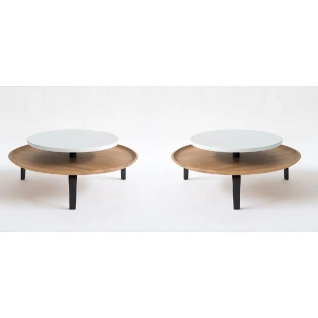 Set of 2, Secreto 85 coffee tables, white, “Nuit de Noel” by Colé ItaliaDimensions: H.32; base plate ø 85, top ø 60 cmMaterials: Coach table with 2 rounded plates; 3 legs and base plate in natural solid oak;top matt lacquered in 5 colors.Also available: different colors, Secreto 80, & lacquered legs (custom color).It comes from the idea of transforming the traditional coffee table, usually overflowing with books, magazines and newspapers, in a ‘coffee table / book table’, where there is really space both for books and for the cups! The upper shelf is enriched with evocative colours taken from fine perfume’s labels of the 20s and 30s. Three legs in solid oak wood, natural or black stained. Lower plate in solid oak, Top lacquered in off- white, off- black, ochre yellow, spicy orange and sky blue.Colé is a young Italian design brand, with a high-end production 100% made in Italy. Born from the experience of Matteo De Ponti, architect, who grew up in one of the most outstanding Milanese design families, and the artistic sensibility of Laura Macagno, degree in Economics and passionate of art and design. Our Mission is to create design icons, beautiful and comfortable pieces that can Stand the test of time, furnishing houses of international and sophisticated clients, and realized with craftsmanship, thus unique. “We love objects which own deep roots, excellent quality, and a strong evocative power. Archetypal forms dressed with new beauty without losing their classical composure”.Our expressive research is inspired by the utopian force of Italian eminences grises architects and designers of the ’50s, the Scandinavian design, the Bauhaus, ethnic handcraft and houses of famous writers of the XX century, all different as a style but united by the intense soul of those who worked and lived there.