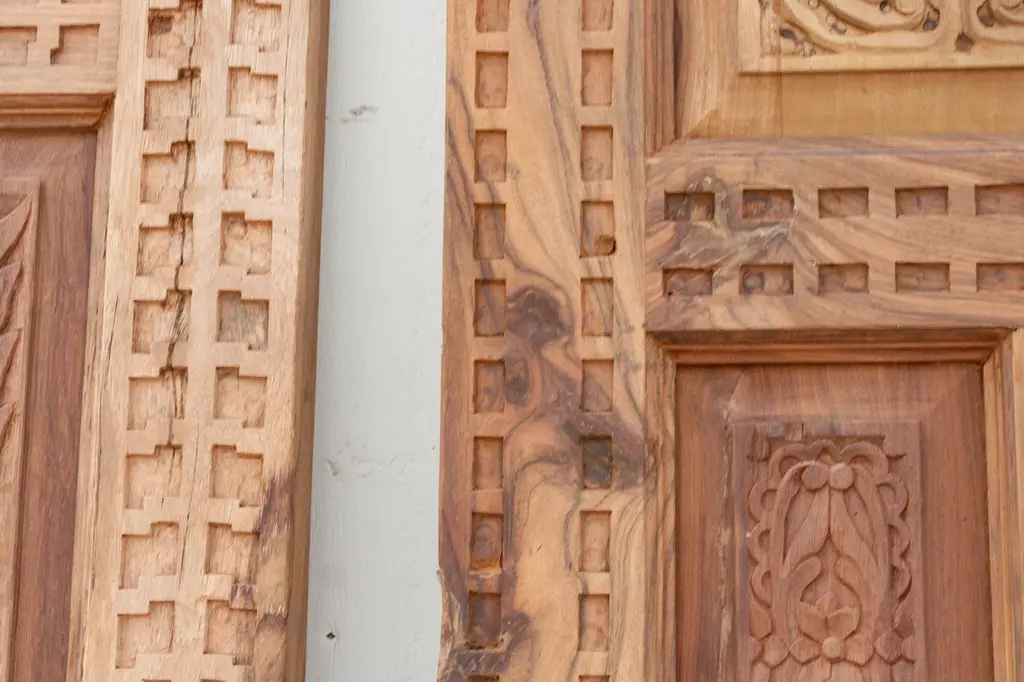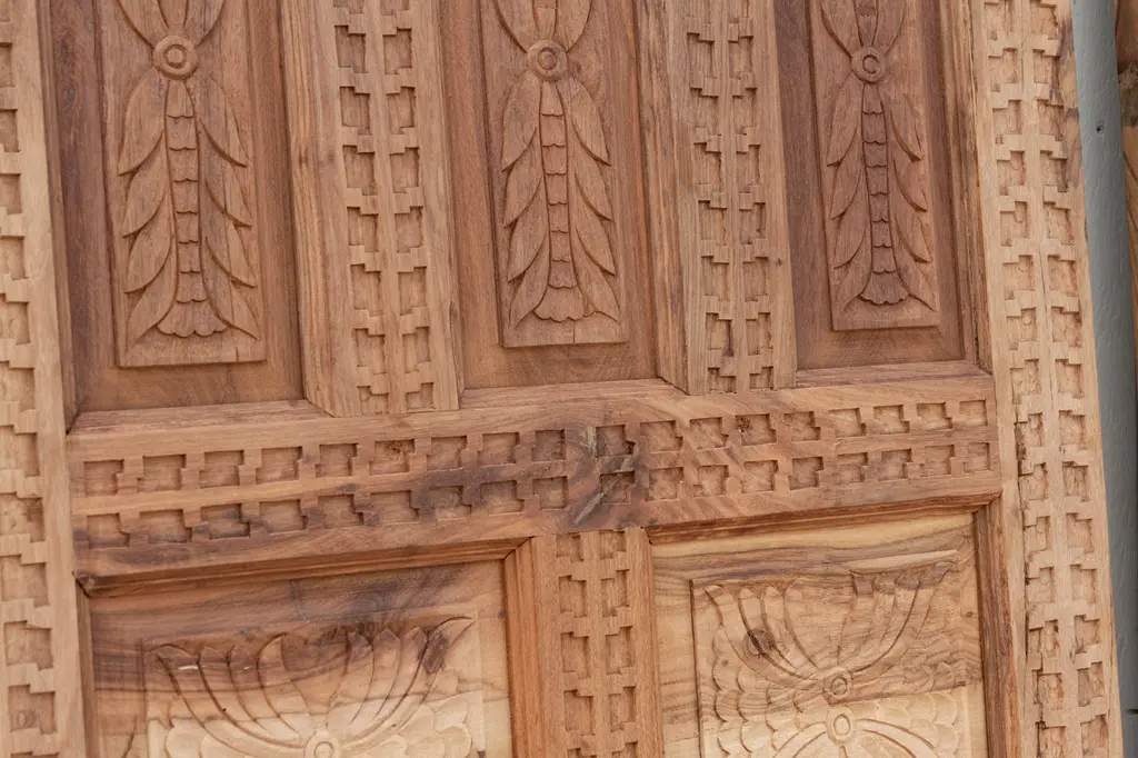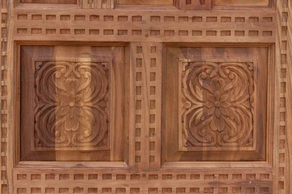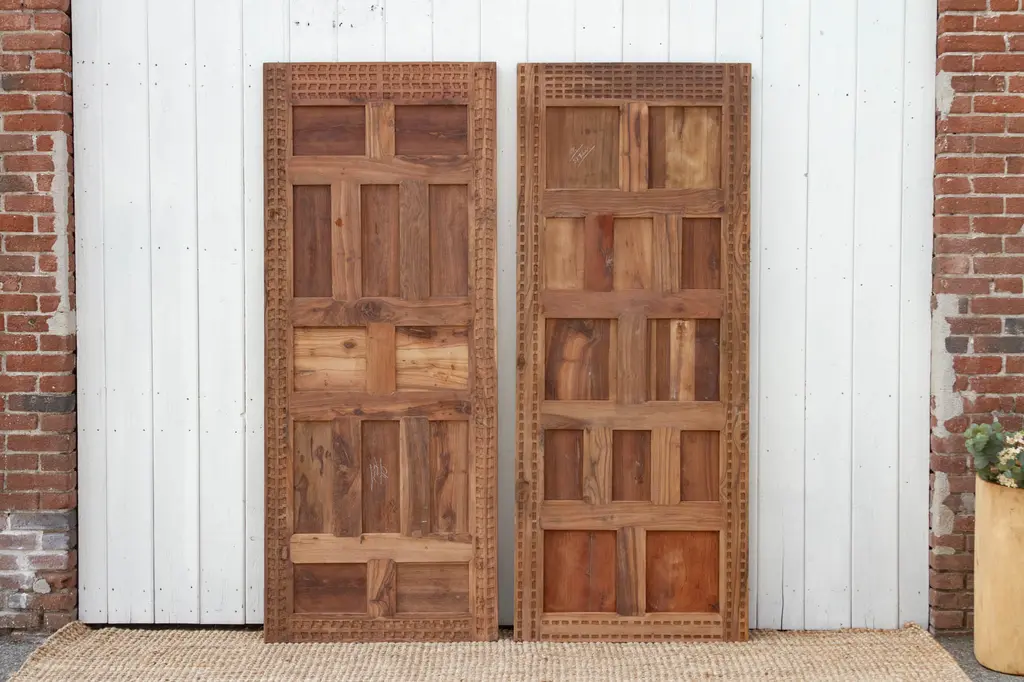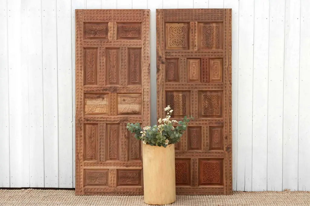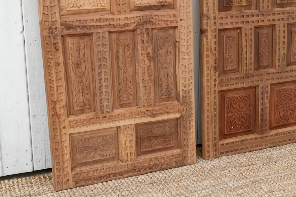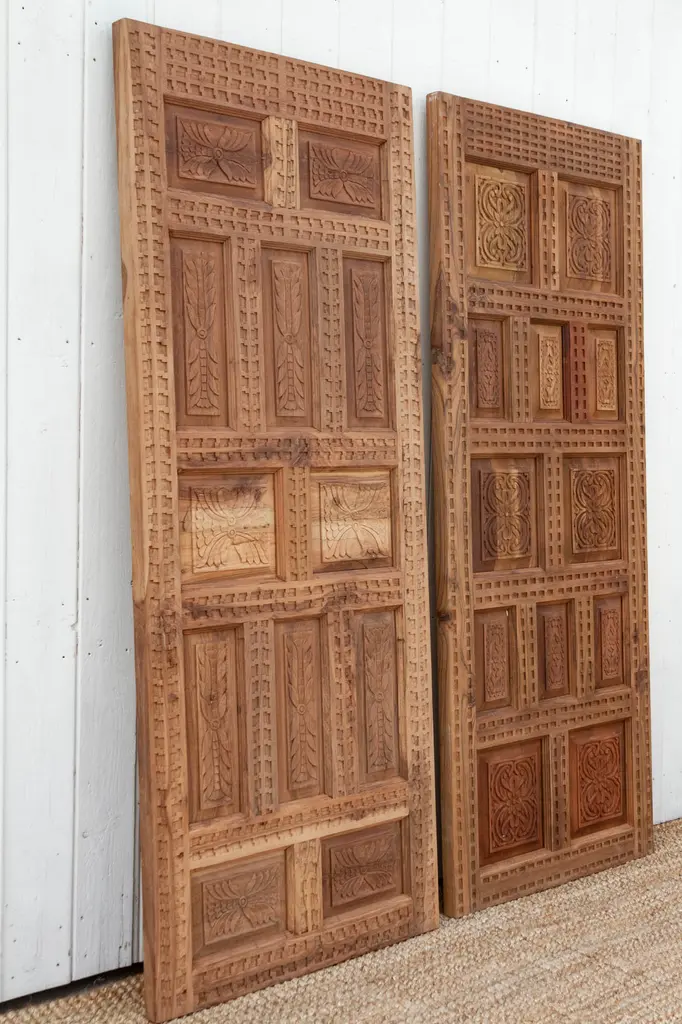 Step back in time with this handsome pair of reconstructed Spanish Colonial doors, directly inspired by the traditional designs of the Peruvian Andes. Each door features a captivating multi-paneled front, where 12 unique carvings in various shapes and sizes depict open flowers. The intricate details extend to the frame, adorned with indented carvings throughout.