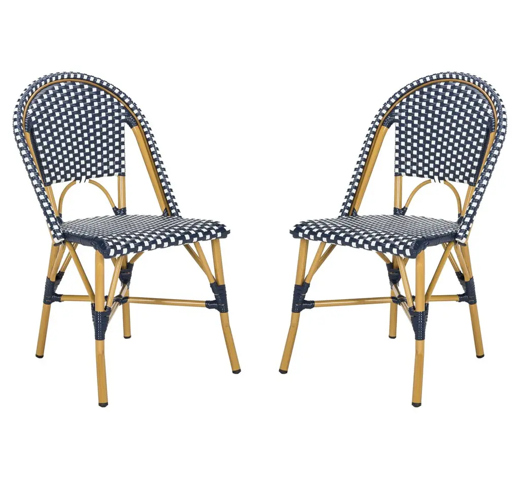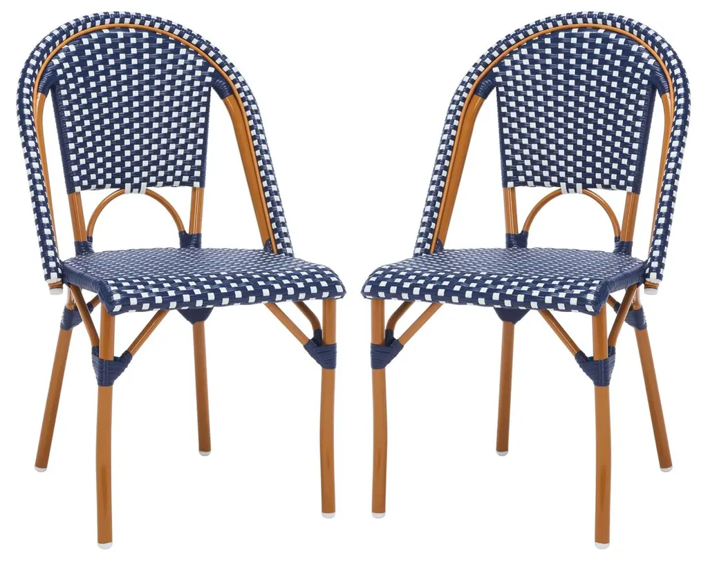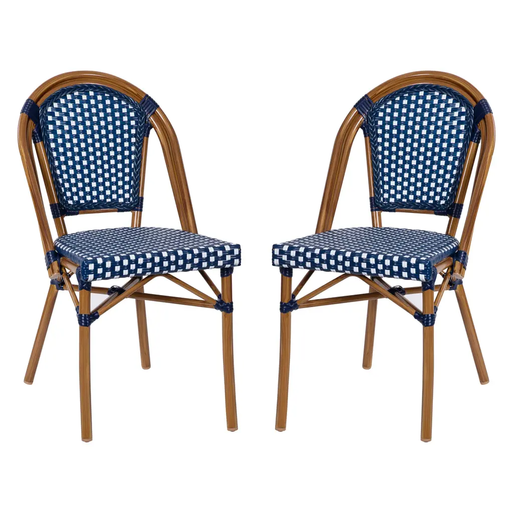 Bring the street vibes of Paris right into your restaurant, bistro, hotel, or backyard patio with this set of 2 indoor/outdoor commercial grade French bistro counter stools. The durable PE rattan back and seat is very comfortable and won't fade when used outdoors. The lightweight, but sturdy, powder coated metal frames will not rust, boast a bamboo look finish, hold up to 600 lbs. static weight, and feature an integrated footrest for added comfort. Recommended stack height for these stools is up to 2 high for storage or transport. For your convenience, these counter stools arrive completely assembled for instant use and feature floor protector glides to prevent damage to indoor hard flooring surfaces. These dining stools easily wipe clean with a damp cloth for quick seating turnaround.Classic Commercial Grade Indoor/Outdoor French Bistro Bar Stool, Set of 2Fade Resistant Navy and White PE Rattan Back and SeatNatural Finish Bamboo Print Metal Frames Will Not RustHolds up to 600 LBS. Static Weight Capacity Per ChairFixed Floor Glides Protect Indoor Flooring SurfacesRecommended Stacking Quantity up to 2 Stools HighNo Assembly RequiredWipes Clean with a Damp ClothSingle Unit Weight: 26 lbsItem Width: 18.5 InchesItem Depth: 22.5 InchesItem Height: 46 InchesBack Size: 17.5"W x 17.5"HSeat Size: 17"W x 16.25"DSeat Height: 30.25"HSeat Thickness: 2Weight Capacity: 600 lbsStack Quantity: 5 Count