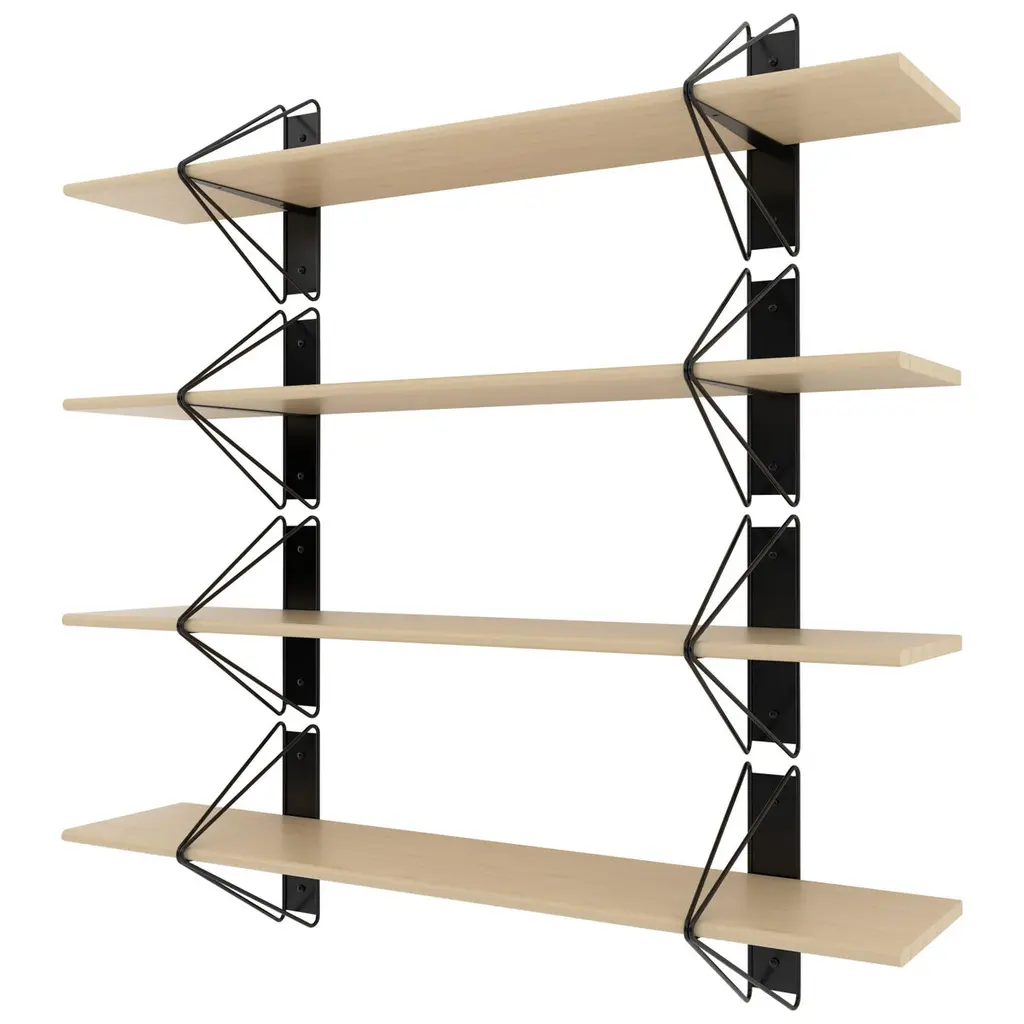 Price on this configuration includes 2 116" Shelves & 8 Brackets. This shelving system is really easy to customize: we offer multiple wood finishes, bracket finishes, and we can adjust the length on a per order basis. You can buy single shelves or use multiples as shown in the main image. Modern minimalism meets Classic architectural construction in the strut shelving system. Inspired by the Manhattan bridge and construction techniques of early aircraft, the modular system is functional and flexible making it ideal for commercial and residential spaces alike. Offered in both powder coated and plated options, the polished simplicity and adaptability of the system is sure to support any interior effortlessly.