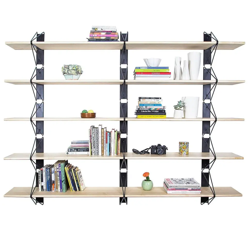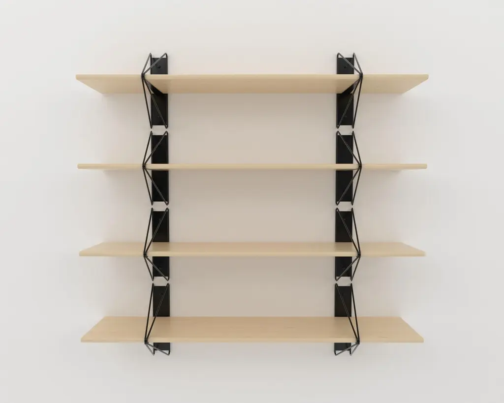 Price on this configuration includes 2 84" Shelves & 6 Brackets. This shelving system is really easy to customize: we offer multiple wood finishes, bracket finishes, and we can adjust the length on a per order basis. You can buy single shelves or use multiples as shown in the main image. Modern minimalism meets Classic architectural construction in the strut shelving system. Inspired by the Manhattan bridge and construction techniques of early aircraft, the modular system is functional and flexible making it ideal for commercial and residential spaces alike. Offered in both powder coated and plated options, the polished simplicity and adaptability of the system is sure to support any interior effortlessly.