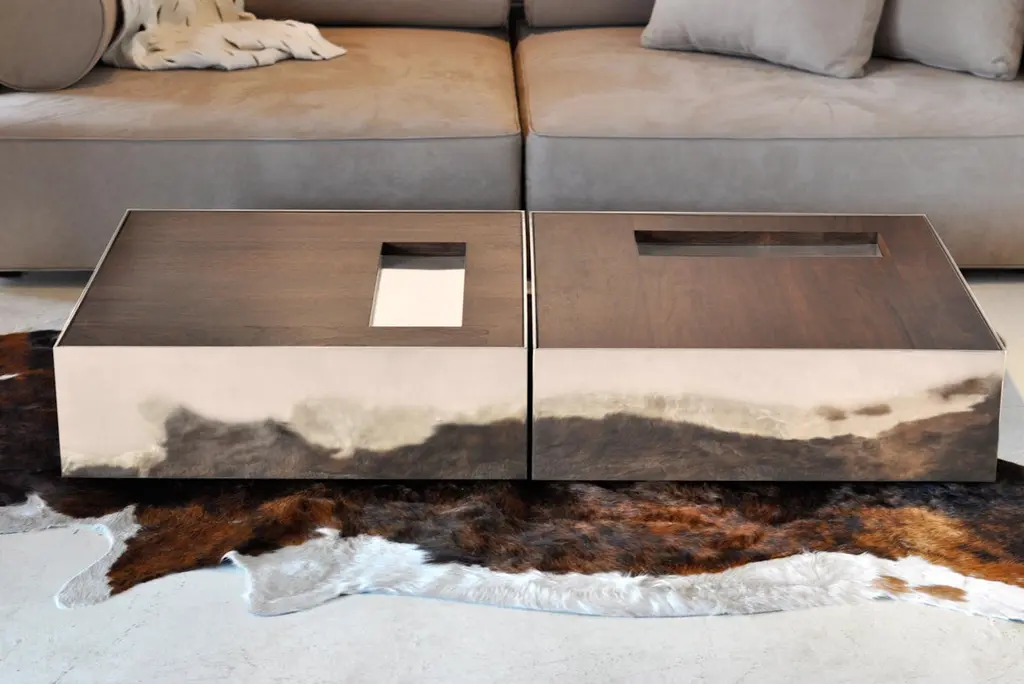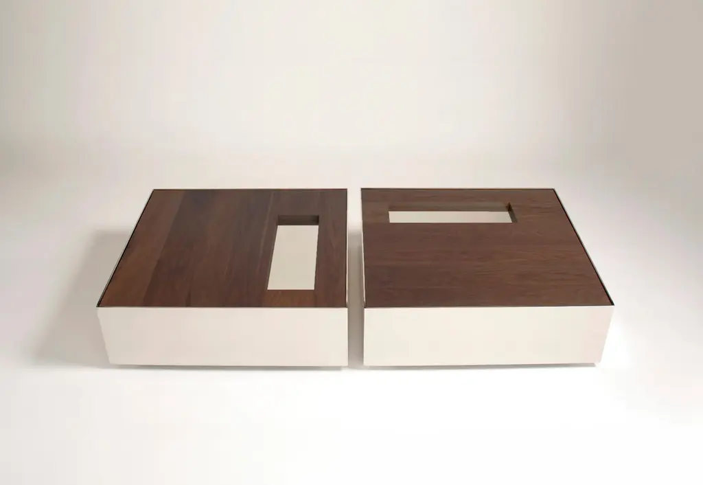 Set Of 2 Walnut Ballot Coffee Tables by Phase DesignDimensions: D 76,2 x W 76,2 x H 25,4 cm.Materials: Walnut and white powder-coated metal.Steel coffee table with solid wood top, available in walnut, white oak, or ebonized oak. Available in polished chrome or powder coat finish. Prices may vary. Please contact us.The Ballot Box invokes the spirit of minimalist artist Donald Judd. Crisp lines unify to create a steel box, and a sleek sunken lumber top is punctuated with a rectangular cut out. The table is constructed out of steel and finished with chrome plating or powder coating. The polished or powder-coated metal is mimicked in the cut out which is under-mounted to the wooden top.Autodidact award-winning designer Reza Feiz has always been drawn to the strength in simplicity. Lured to Southern California by its inventive, creative spirit, he quickly discovered his true calling among the vast community of creators and artisans whose skills and ingenuity expertly transform imagination into reality.Inspired by Los Angeles’ iconic landscape and the compelling beauty of the places and spaces he encountered, he envisioned furniture, lighting and tabletop accessories, fabricating them from contemporary materials with the help of a tightly knit coterie of craftspeople.The resulting restrained yet revolutionary pieces have garnered enthusiasm from an international audience.He’s been lauded as “An American designer who influences world design”, a “Style Pioneer” and “One of a group of select young designers who represent the leading edge of discovery in design.” Architectural Digest’s Mayer Rus noted that his “wide-ranging collections make a strong case for the enduring appeal of restrained modern design.” Surface Magazine raved that he “imbues his work with a 21st-century edge. His astute sense of restraint keeps the designs relevant in a constantly evolving industry, without needing to subscribe to trends.”“Reza Feiz imbues his work with a 21st-century edge. His astute sense of restraint keeps the designs relevant in a constantly evolving industry, without needing to subscribe to trends.”