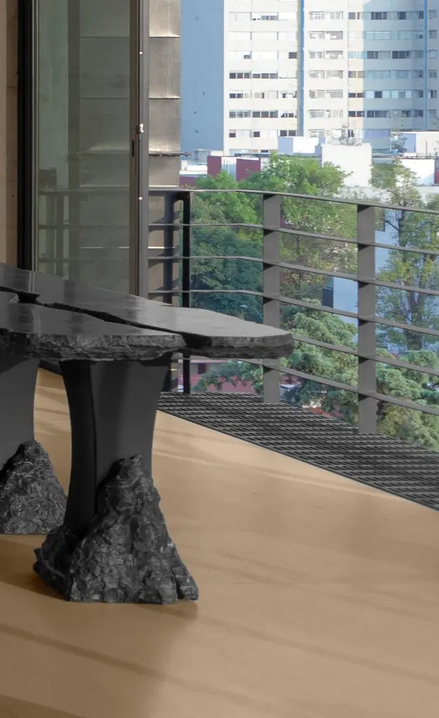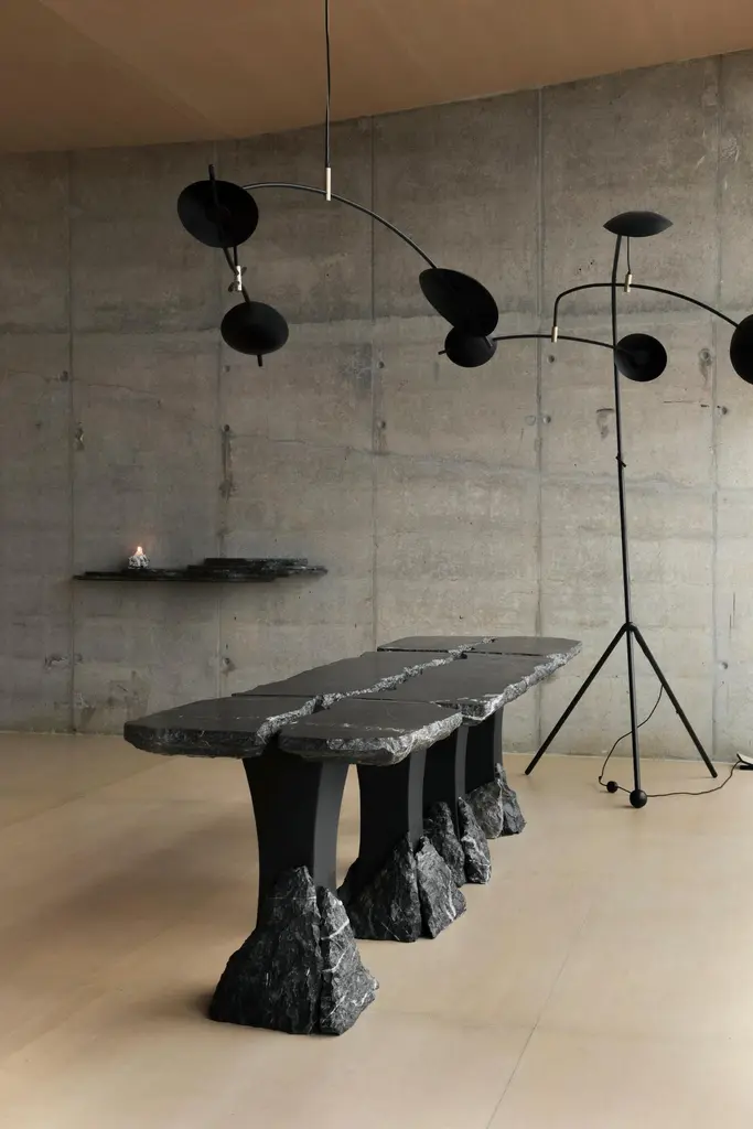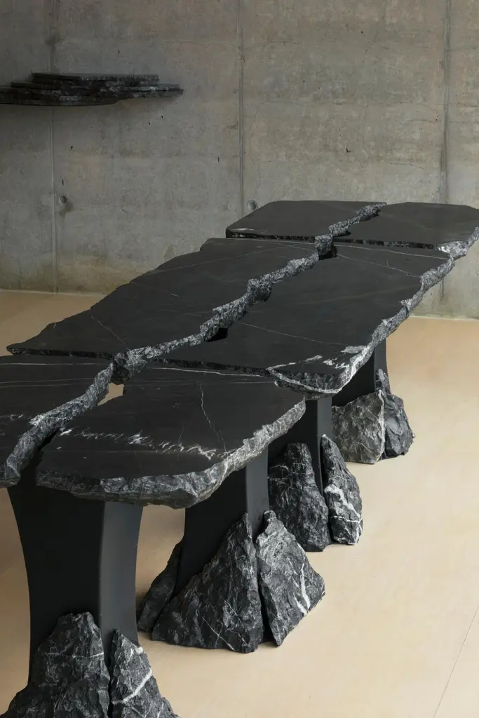 Set of 3 Divergente tables by Andres MonnierOne of a Kind.Dimensions: W 100 x D 160 x H 70 cm / W 90 x D 80 x H 70 cmMaterials: black marble.1 x Divergente Dos table2 x Divergente Uno tableA divergent boundary occurs when two tectonic plates move away from each other. Along these boundaries, earthquakes are common and magma rises from the Earth's mantle to the surface, solidifying to create new oceanic crust. This piece is made with one whole black marble plate divided in two and some marble crusts in the bottom. A void is emerging to the surface, one plate is splitted and now is composed from two pieces. If cracks keep appearing, how many fragments compose its whole plate? its whole self? Cracks are needed to let light inside.Designer's biographyTreko concrete is a Mexican studio based in Ensenada, that has as a purpose to create functional handcrafted furniture and sculptural pieces to tell stories with art and design. With the direction of Andres Monnier, Treko concrete now creates handmade fire pits, art objects, and functional furniture with natural stone, mirror, concrete, wood, and metal. Treko works with different techniques and languages of creation to innovate new purposes in conventional furniture.
