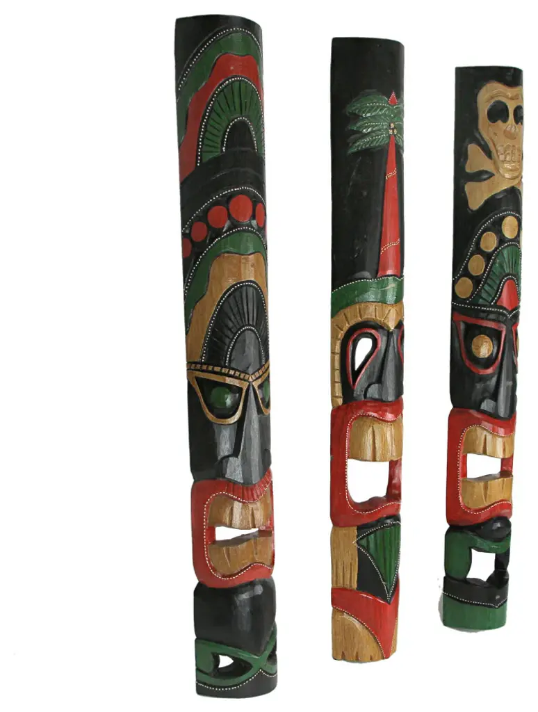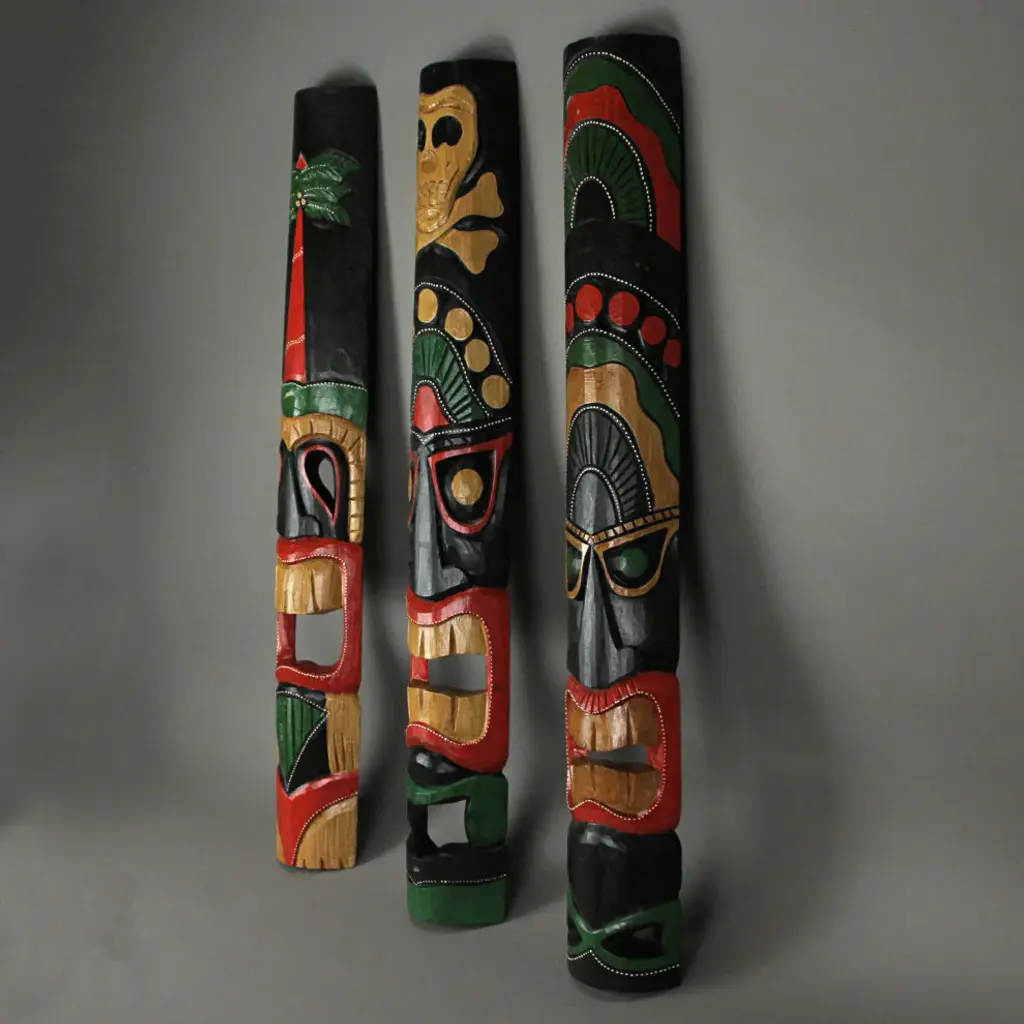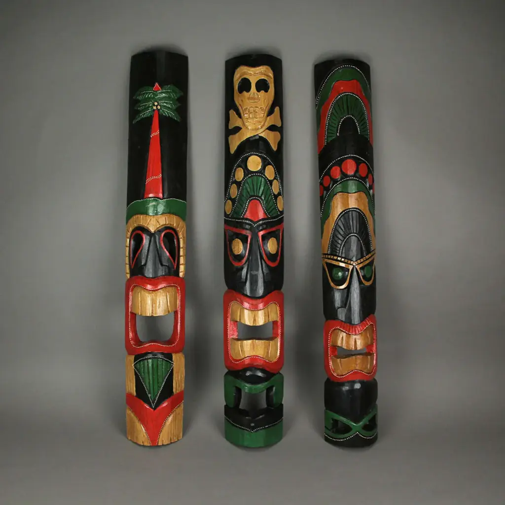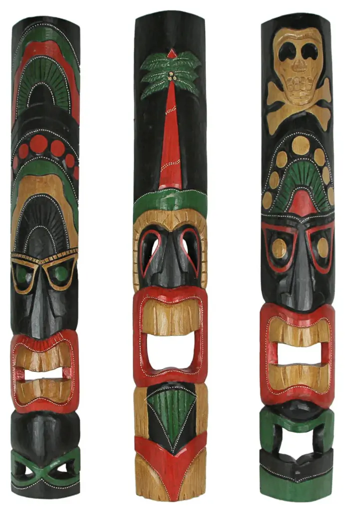 Impressive Dimensions - Standing tall at 39.5 inches and measuring 5.5 inches wide and 4 inches deep, these masks make a striking statement, perfect for your Polynesian-themed decor.Expert Craftsmanship - Crafted by skilled Indonesian artisans, these masks are hand-carved from sustainable wood. Each piece represents the artistry and tradition of Polynesian culture, making them unique additions to your space.Vibrant Island Hues - These masks are brought to life with a hand-stained and hand-painted finish, featuring bright island colors. Their lively tones add an exotic touch, enhancing the ambiance of any room or outdoor area.Versatile Display - Whether leaning against the wall or hung up using the pre-attached loop hanger on the back, these masks offer flexible display options. Their easy installation makes them suitable for any wall in your home or outdoor patio.One-of-a-Kind Artistry - Due to their handcrafted nature, each mask carries its own charm. No two masks are exactly alike, ensuring that your set is unique. Embrace the slight variations in size, style, and color, showcasing the authenticity and individuality of these exquisite pieces.Transform your space into a tropical paradise with this set of 3 intricately crafted primitive-style tiki masks, perfect for Polynesian-themed rooms, patios, or tiki bars! Each mask, standing at approximately 39.5 inches tall, 5.5 inches wide, and 4 inches deep, is meticulously handcrafted by skilled Indonesian artisans from lightweight and sustainable Albesia wood. These masks boast vibrant hand-stained and hand-painted finishes in lively island hues, seamlessly blending with various decors. Their versatility shines as they effortlessly adorn any wall, adding a playful accent. Thanks to the convenient loop hanger on the back, mounting these masks is a breeze. Embrace the uniqueness of handmade artistry; each mask is a testament to skilled craftsmanship. As they are crafted individually, no two masks are exactly alike, ensuring that your set is genuinely one-of-a-kind. Let the rustic charm of these wooden masks elevate your decor, infusing your space with the spirit of the islands and the artistry of Polynesian culture. Perfect for indoor and outdoor settings, these masks add a touch of exotic elegance to your home or patio, creating an inviting atmosphere reminiscent of tropical islands.