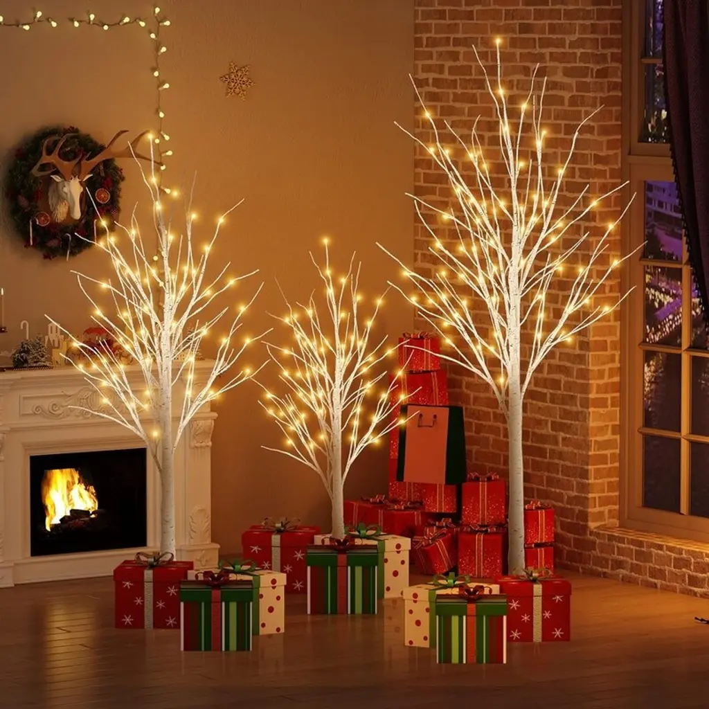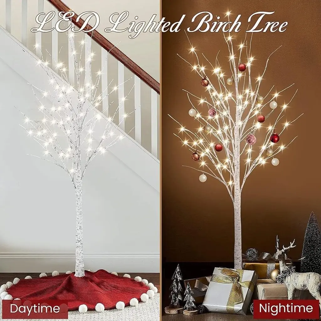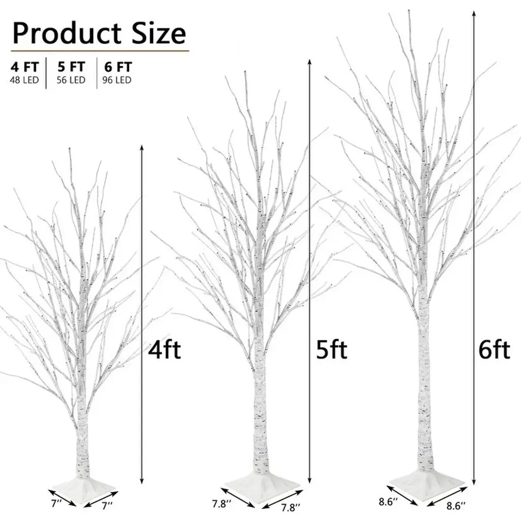 It’s the most wonderful time of the year, and if your Christmas decor needs a quick refresh, this lighted tree set is the perfect pick. Crafted from metal and PVC, this piece features a birch tree silhouette with 92 white LED lights, so it brightens up your space in an eye-catching holiday style. At 4-feet, 5-feet, and 6-feet in height, you can design your own personal Christmas holiday setting. The 3-piece holiday trees are perfect for limited floor space. Place all three trees together to build a stunning holiday pine forest display, or separate each tree and place them individually throughout your home to accent various settings. The metal tree stand is included. This piece is designed to make a statement and can be used both outdoors and indoors.Features:Safe To Use - Metal Stable base provides stability and not easy to break. Made of PVC Material. Durable and reusable. The Fall tree lights will not be hot, safe and energy saving. You can bend the branches into any shape as you want, and hang some lightweight ornaments for your DIY decorating.Prelit Lighted Birch Trees - Life-like tree bark texture create a natural and romantic atmosphere at home on winter holidays or festivals. The brightly lit trees are beautifully shaped, and the fairy-tale warm yellow cherry blossom light can bring a warm atmosphere to the space. When you watch the decorative tree of lights as if you were seeing the stars outside.Bendable Branches - Birch tree branches are flexible enough to bend into multiple desired positions and hang holiday decorations to create your own winter wonderland. The branches can be scattered like a real tree or bent like a bunch, DIY shape the branches to your liking.Celebration Decorations - Still looking for the right holiday decorations? This lighted trees are equipped with a 10ft extension cord for your leisurely life. It can be used for every holiday decoration, eye-catching decoration for Christmas Easter Valentine's Day, widely used in parties, Weddings, gardens, Bedrooms, Living rooms and Patio. Whether indoor or outdoor, delicate lights tree are one of the decorations.Easy to Assemble - The whole lighted Christmas tree structure is divided into 2 or 3 parts, which are easy to assemble together. Take out the tree stand, put the trunk into the tree and tighten the grooves and convex grooves, insert the top of the trunk into the bottom of the trunk and tighten. You can also place your and your family's favorite decorations on the Christmas tree.Specifications: