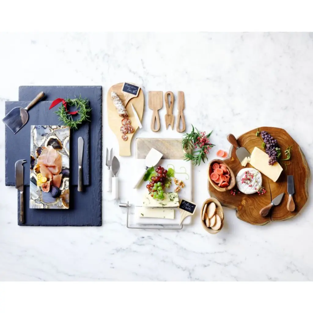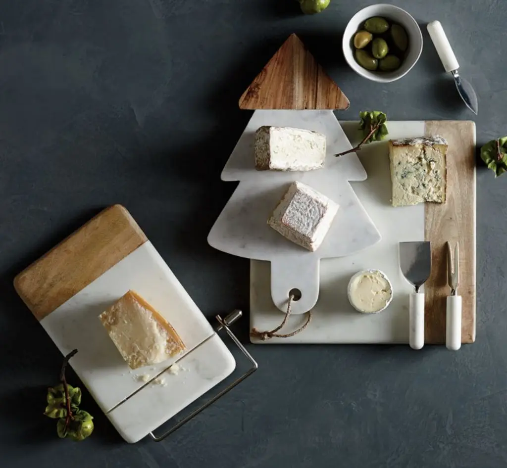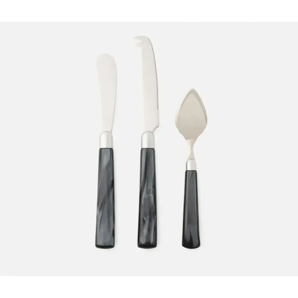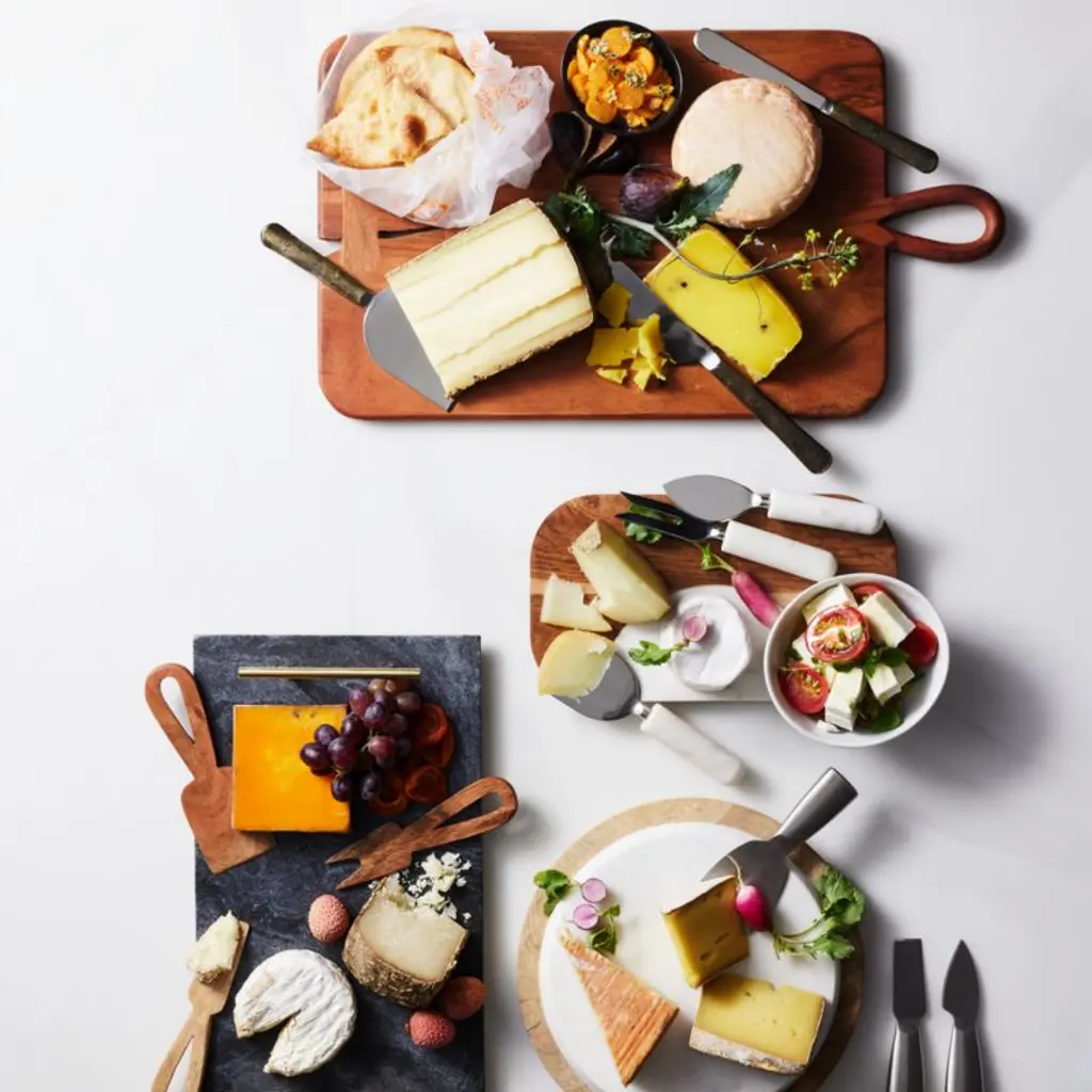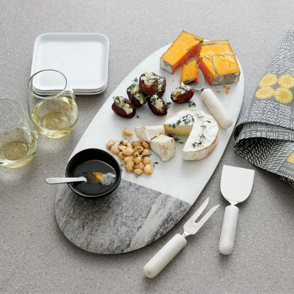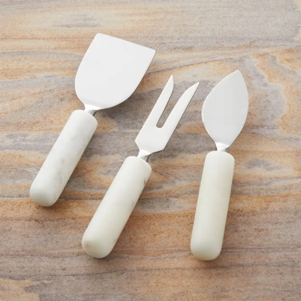 Ultra-contemporary blade styling and substantial cylinder handles in natural white marble make this complete set of soft, semi-soft and hard cheese knives an elegant choice for cheese boards and buffets. Use the pointed knife for parmesan and other hard cheeses, the slim rectangular knife for Brie and other soft cheeses, and the broad blade for everything in between.Looking for gift ideas? Browse more gifts under $50.