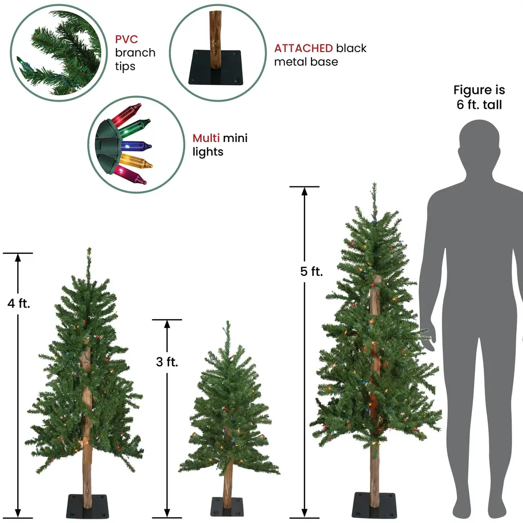 Celebrate a country Christmas with family and friends this season. These rustic Alpine trees are perfect for your holiday decor. Decorated with multi-color lights these trees are sure to impress. Display plain or add ornaments for a bit of extra flair. Product Features of the 3 Feet Tree: Pre-lit with 50 multi wide angle lights. 195 branch tips. 2-piece easy assembly. 20" base diameter (widest point). Medium profile tree. Product Features of the 4 Feet Tree: Pre-lit with 100 multi wide angle. 337 branch tips. 2-piece easy assembly. 24" base diameter (widest point). Medium profile tree. Product Features of the 5 Feet Tree: Pre-lit with 150- multi wide angle. 475 branch tips. 2-piece easy assembly. 28" base diameter (widest point). Slim profile tree. Additional Features For All Trees: Green lead cords. Light sets on tree are UL certified and approved for indoor or outdoor use however the tree itself is recommended for indoor use only. Realistic wood trunk with attached black metal base. Wire gauge: 22. 120 volts 60 hertz 0.17 amps 20.4 watts. Material(s): PVC/metal/wood/glass bulbs/wire. Set includes 1 of each item shown for a total of 3 items. Note: Branches are compressed for shipment and need to be fluffed out upon arrival to look like the photo.