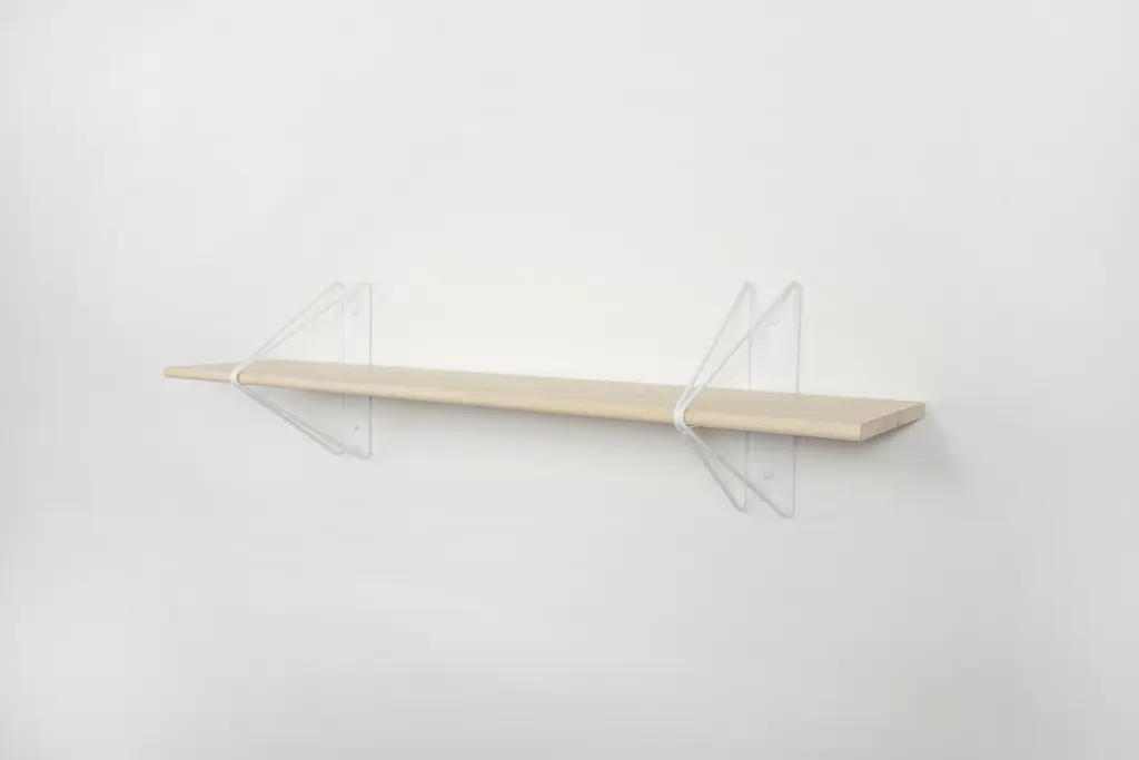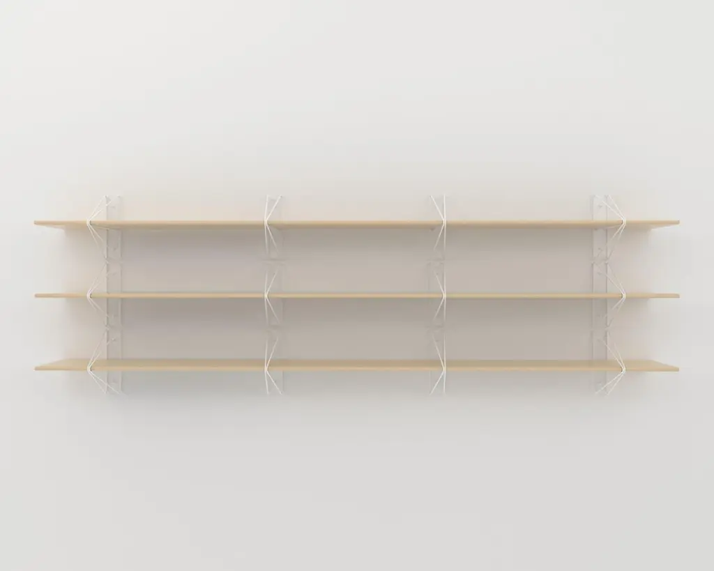 Price on this configuration includes 3 116" shelves and 12 brackets. This shelving system is really easy to customize: we offer multiple wood finishes, bracket finishes, and we can adjust the length on a per order basis. You can buy single shelves or use multiples as shown in the main image.Modern minimalism meets classic architectural construction in the strut shelving system. Inspired by the Manhattan bridge and construction techniques of early aircraft, the modular system is functional and flexible making it ideal for commercial and residential spaces alike. Offered in both powder coated and plated options, the polished simplicity and adaptability of the system is sure to support any interior effortlessly.