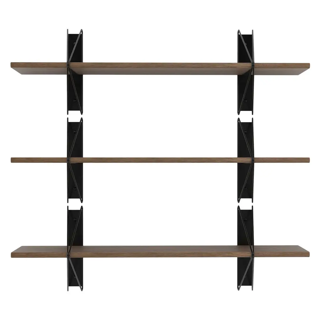 Price on this configuration includes 3 52" shelves & 6 brackets. This shelving system is really easy to customize: we offer multiple wood finishes, bracket finishes, and we can adjust the length on a per order basis. You can buy single shelves or use multiples as shown in the main image. Modern minimalism meets Classic architectural construction in the strut shelving system. Inspired by the Manhattan bridge and construction techniques of early aircraft, the modular system is functional and flexible making it ideal for commercial and residential spaces alike. Offered in both powder coated and plated options, the polished simplicity and adaptability of the system is sure to support any interior effortlessly.